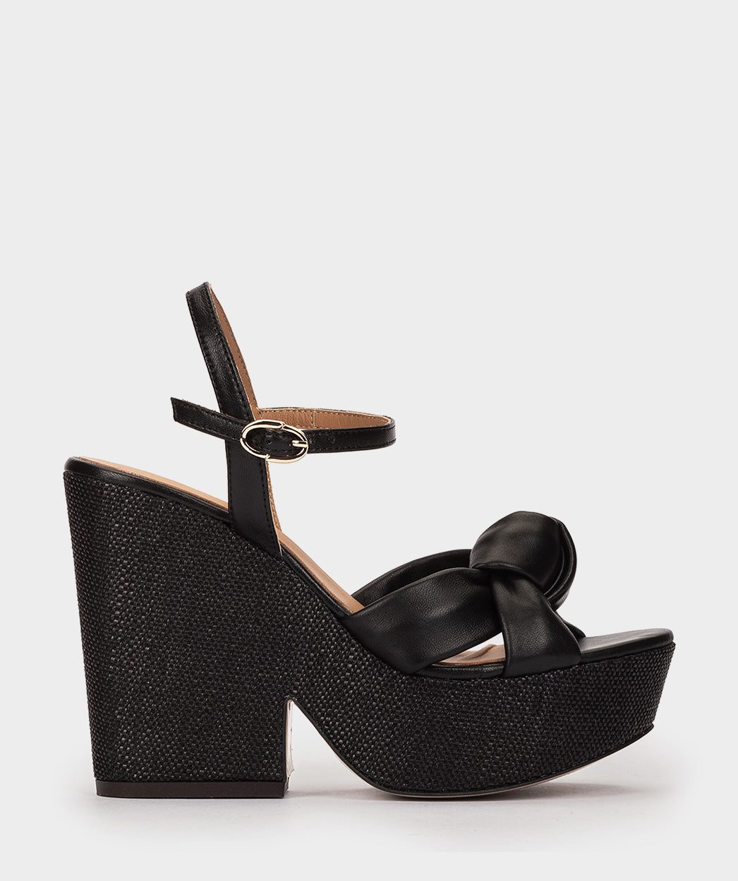 Sandalias de piel de color negro con cuña de rafia. Un modelo veraniego perfecto para lucir en la temporada estival. Si silueta ofrece una sujeción óptima, gracias a la forma de la pala.