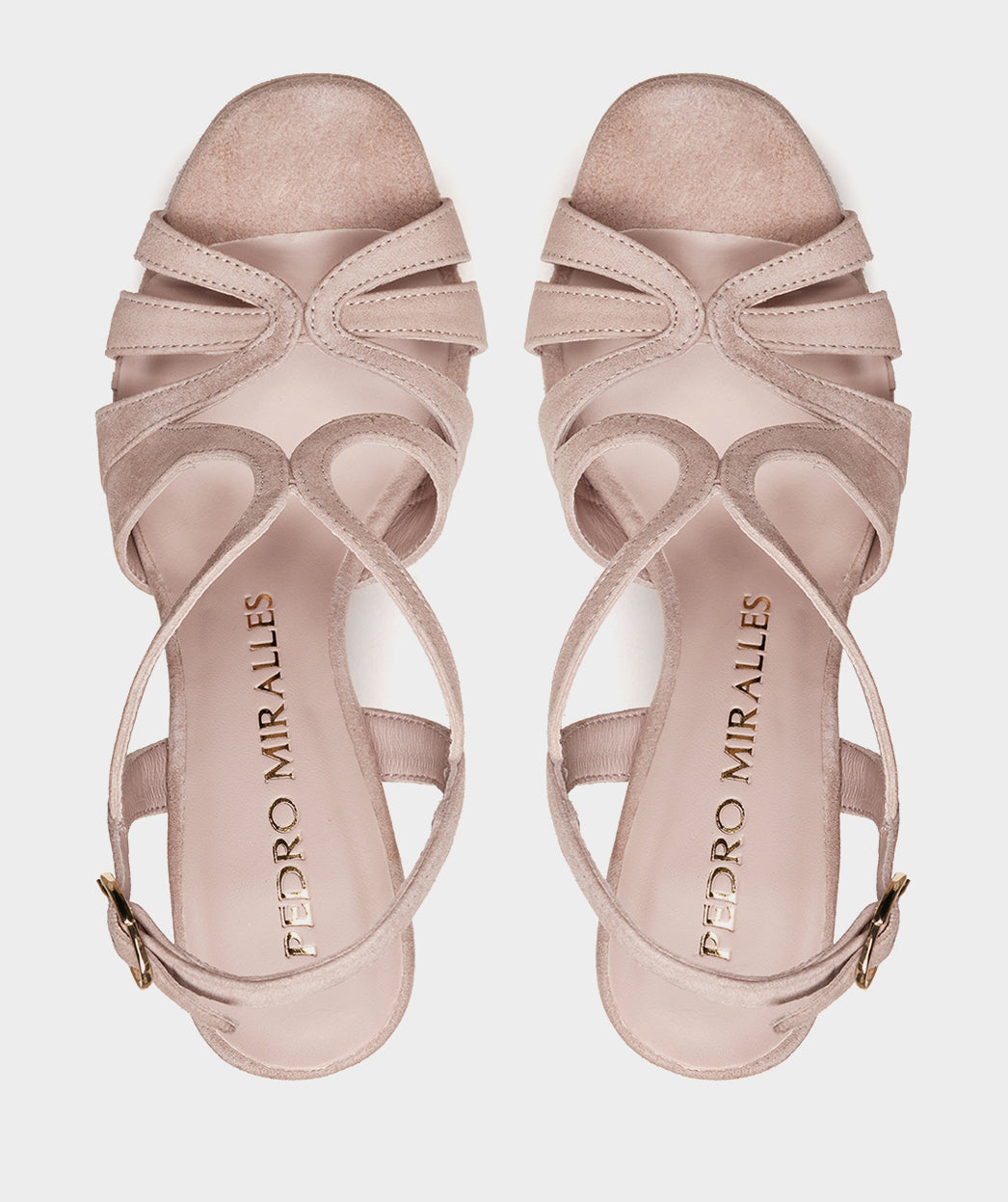 Sandalias de tacón frabicadas en ante de color rosa. Confeccionadas con tiras curvadas sobre el empeine para crear un escote elegante y único. Sin duda, un modelo que estiliza gracias a su diseño especial.