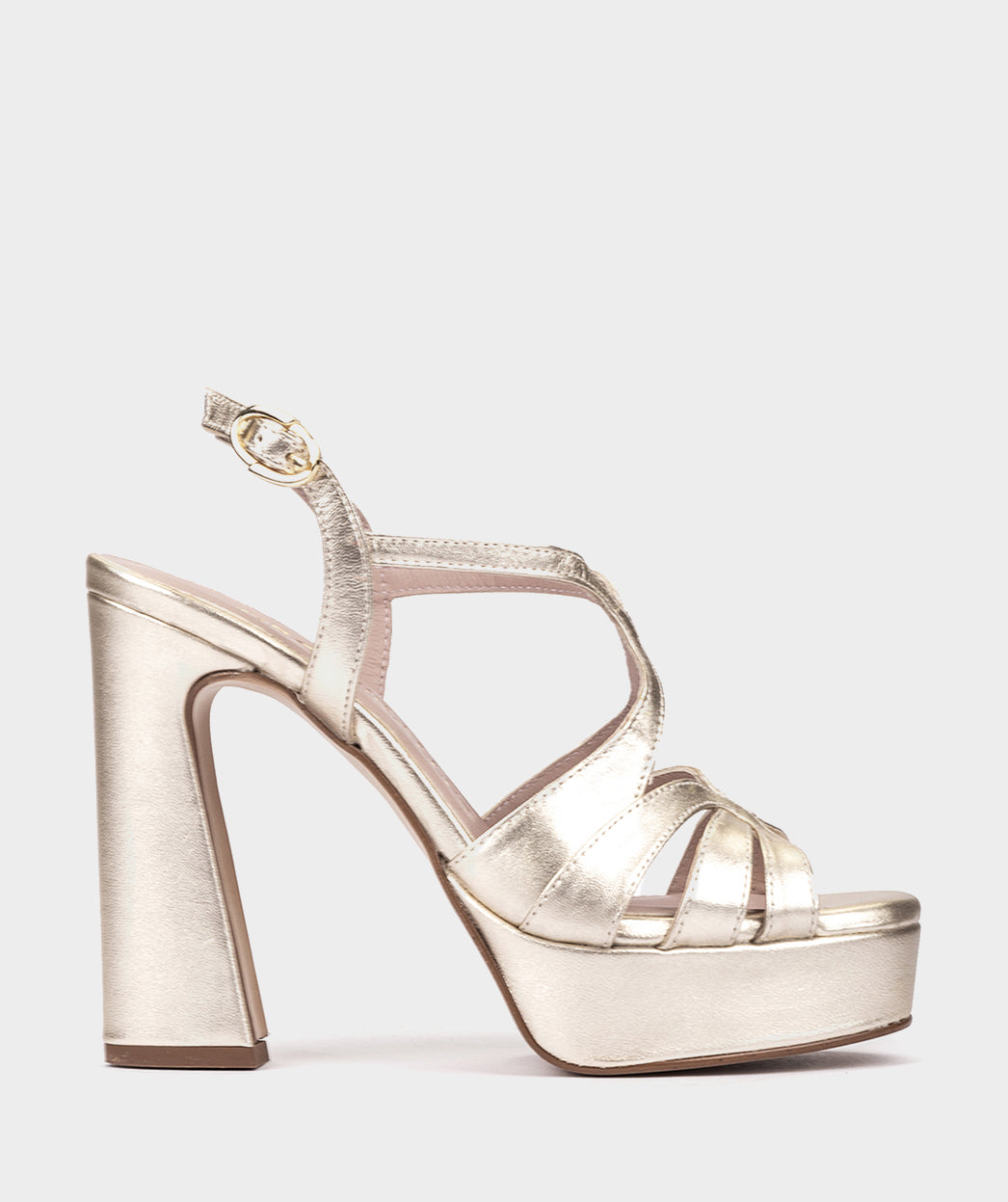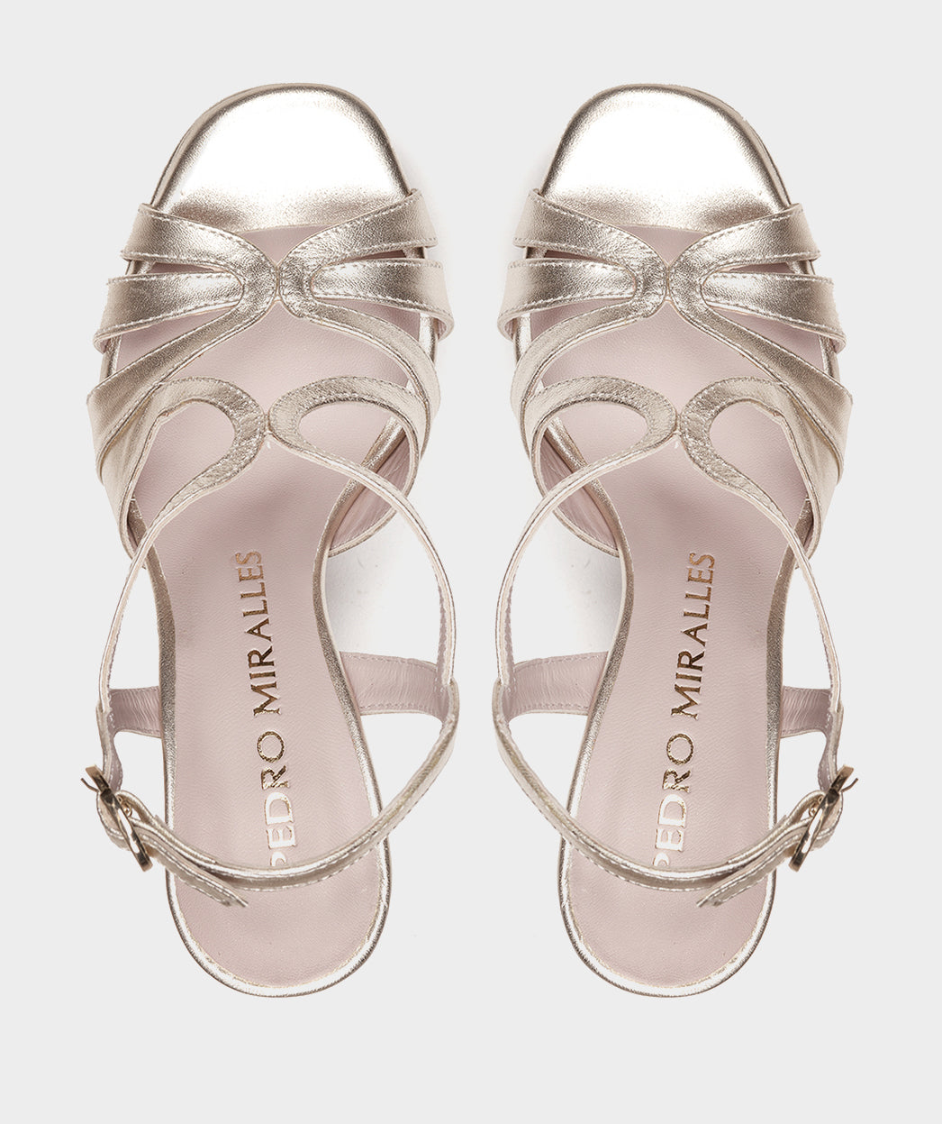 Sandalias de tacón de piel metalizada. Confeccionadas con tiras curvadas sobre el empeine para crear un escote elegante y único. Sin duda, un modelo que estiliza gracias a su diseño especial. .