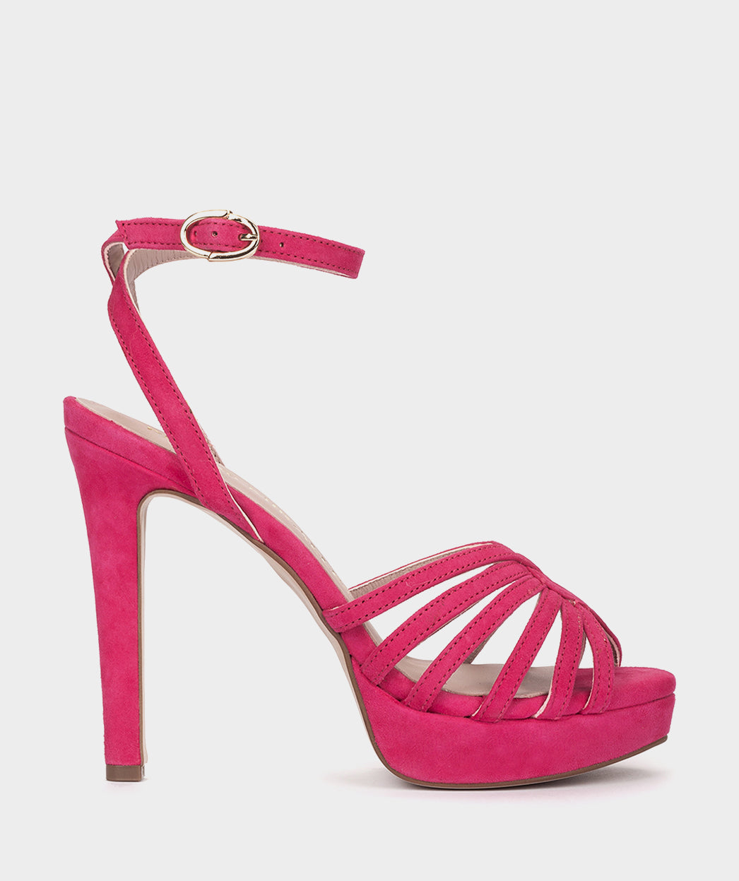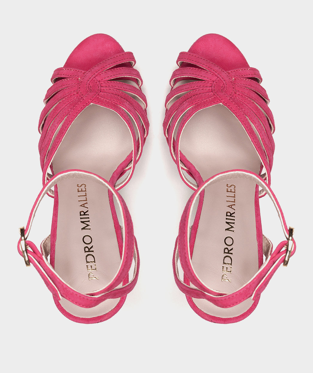 Sandalias de tacón con plataforma de ante en color frambuesa. El modelo Etiopia consigue realzar la silueta del pie gracias a la confección de la pala de tiras. Cierre de pulsera al tobillo. Un modelo original y elegante pensado para tus eventos más especiales.