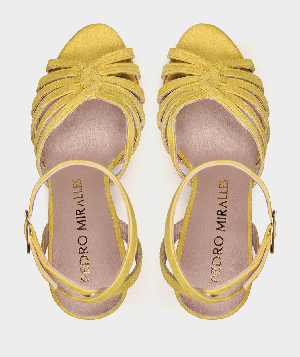 Sandalias de tacón con plataforma de ante en color lima. El modelo Etiopia consigue realzar la silueta del pie gracias a la confección de la pala de tiras. Cierre de pulsera al tobillo. Un modelo original y elegante pensado para tus eventos más especiales.