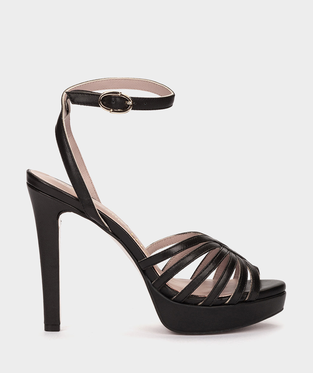 Sandalias de tacón con plataforma de piel de color negro. El modelo Etiopia consigue realzar la silueta del pie gracias a la confección de la pala de tiras. Cierre de pulsera al tobillo. Un modelo original y elegante pensado para tus eventos más especiales.