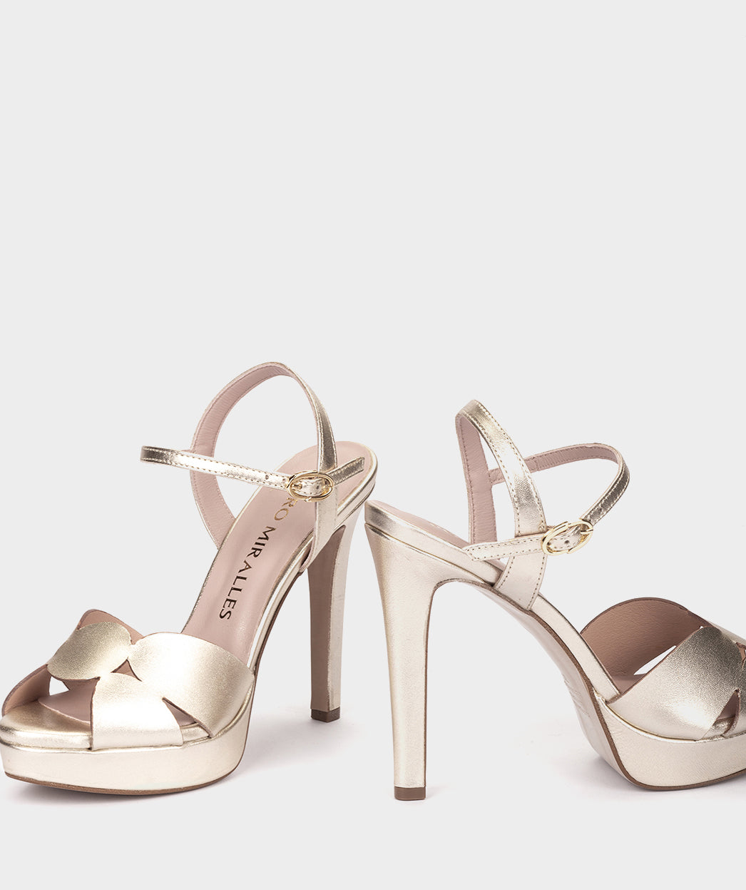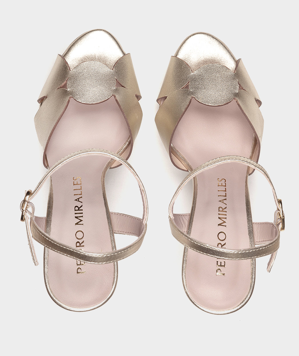 Sandalias de tacón con plataforma de piel metalizada en color platino. Realza la silueta del pie por la confección de la pala con figuras geométricas. Cierre con pulsera al tobillo y hebilla.