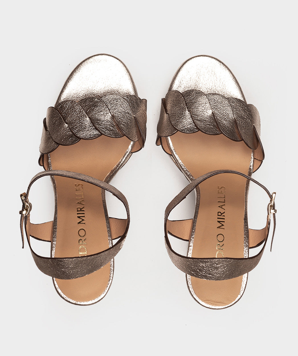 Sandalias de tacón de piel metalizada de color gris bronce. Un modelo moderno y atrevido que combina la piel con la plataforma y el tacón de madera. El diseño refleja el espíritu mediterráneo propio de las noches de verano.