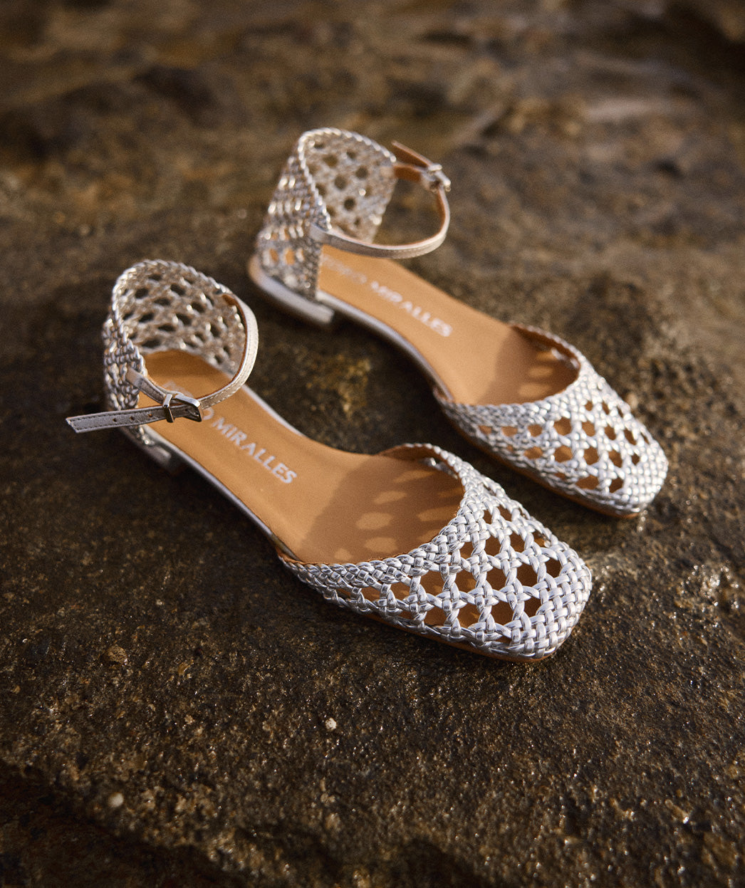 Zapato plano trenzado en color acero. Ya sea paseando por la ciudad o disfrutando de un día en la playa, el modelo Santorini es la opción ideal para aquellas que buscan la combinación perfecta de elegancia y artesanía en su calzado.