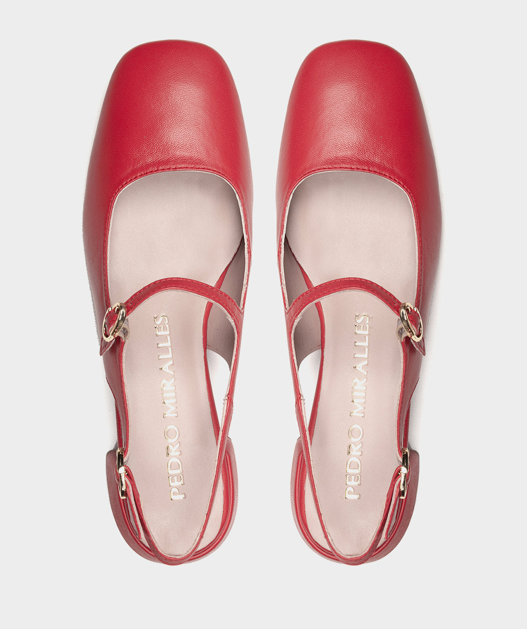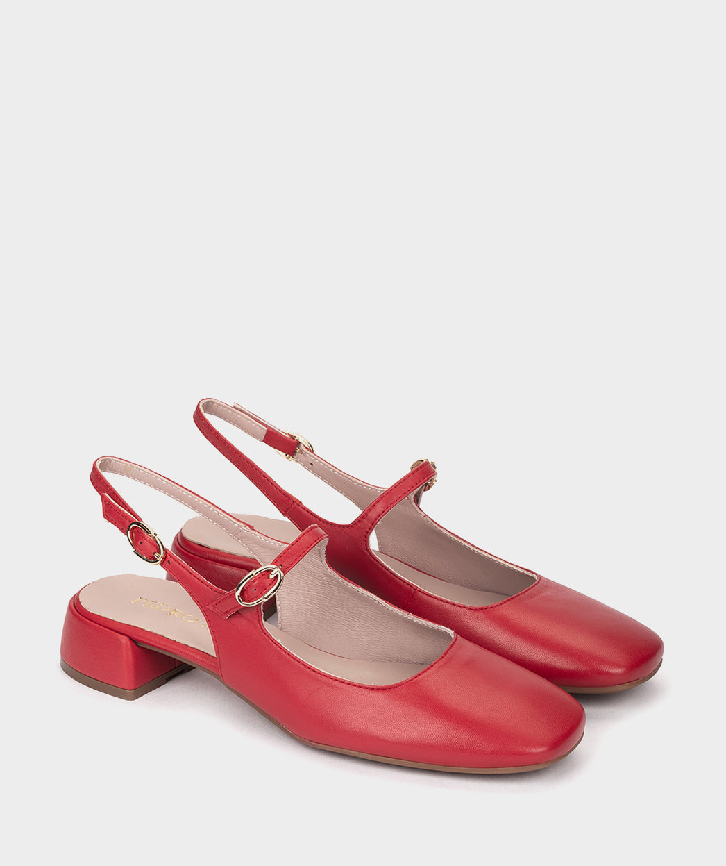 Zapatos de tacón destalonados de piel de color rojo. Los zapatos que te acompañarán en tu día a día y también en citas especiales, gracias a su versatilidad. La opción perfecta para quienes prefieren un tacón bajo.