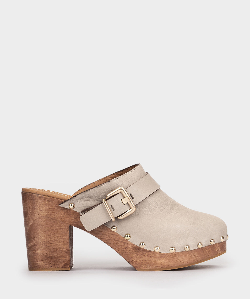 Zuecos de piel beige con hebilla. Un diseño de estilo boho-chic que destaca por las tachuelas que envuelven la silueta del modelo, así como la hebilla colocada en uno de los laterales. Apuesta por los zuecos esta temporada.