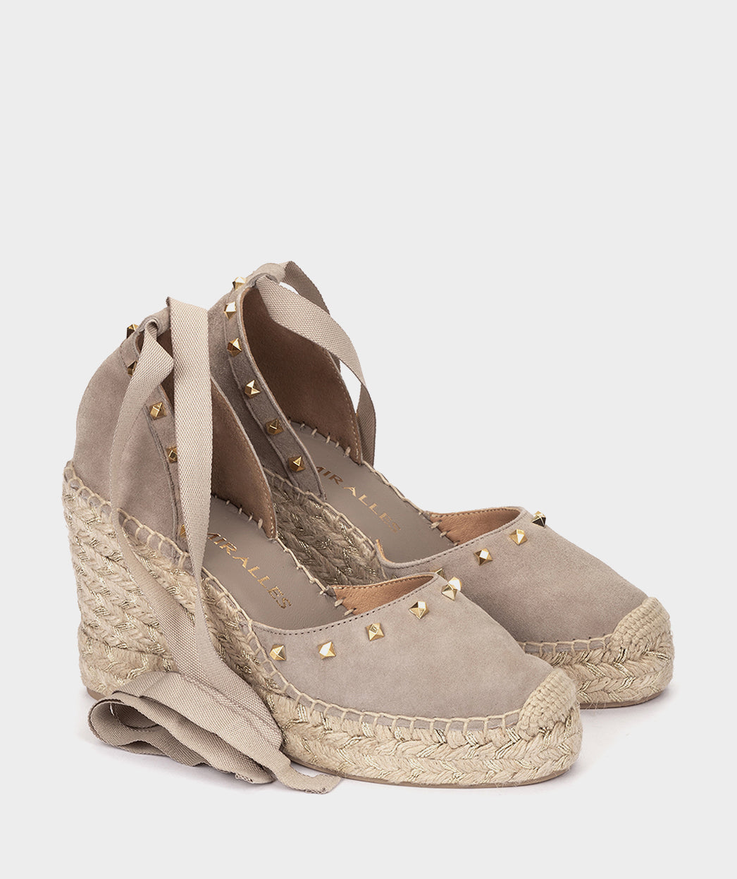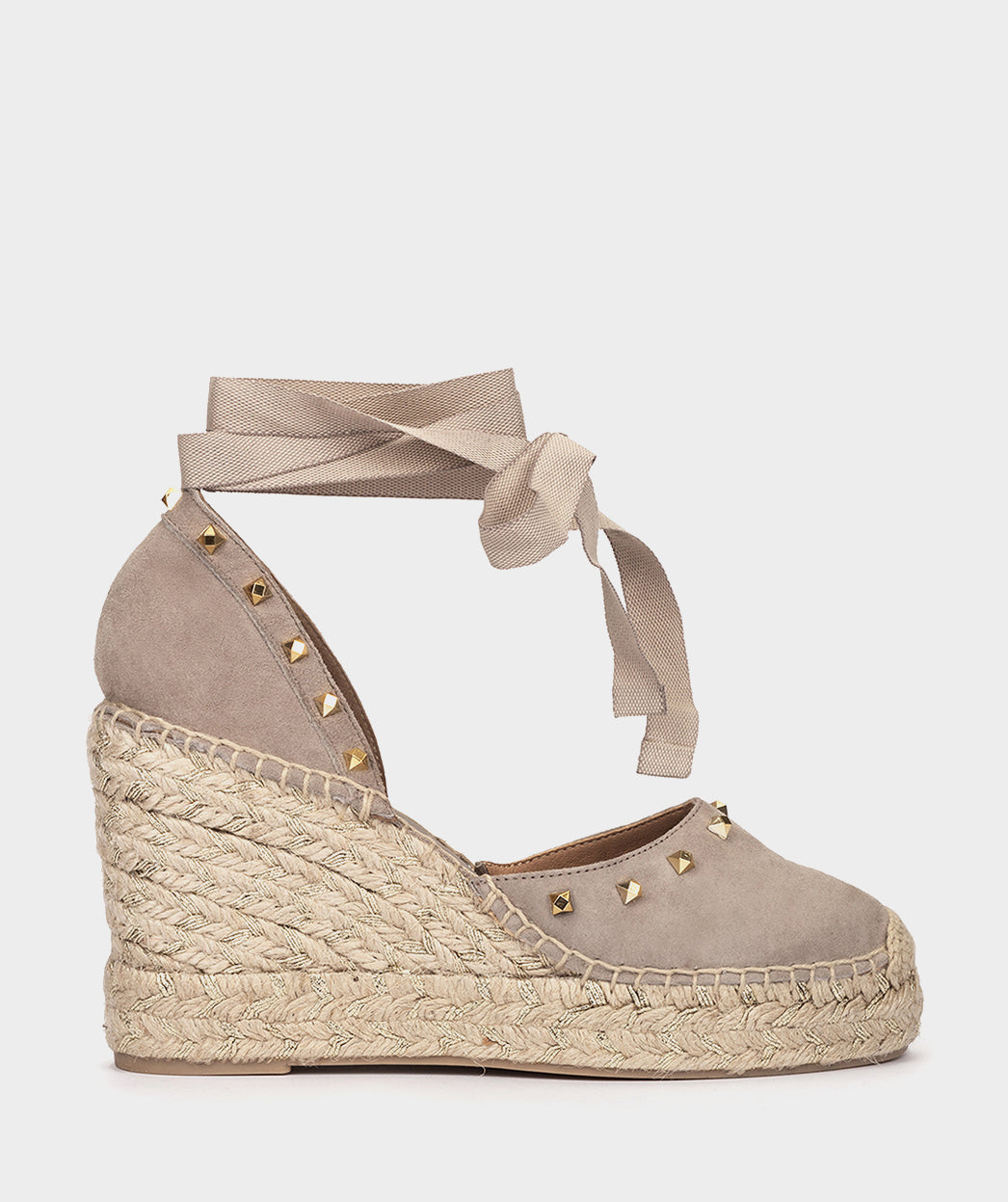 Cuñas de ante de color gris con tachuelas. Un modelo diseañdo para que buscan altura y comodidad a partes iguales, sin dejar de lado el diseño. Las amantes de las alpargatas se enamorarán del modelo MILAGROS, que destaca por su cinta al tobillo y el detalle de las tachuelas.