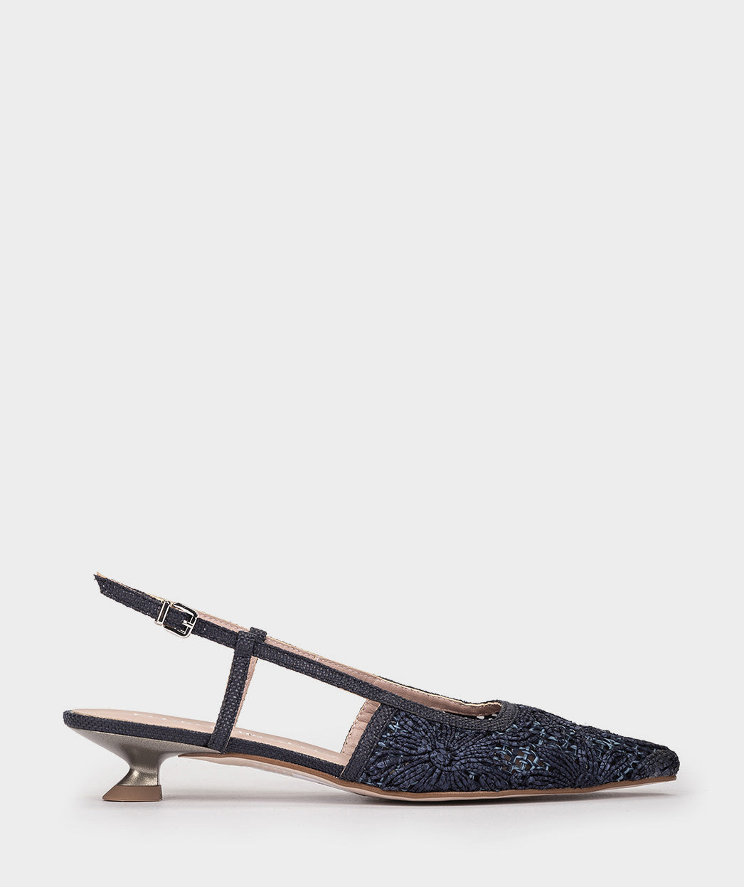 Zapatos de tacón destalonados fabricados en rafia floral en tonos azules. Un diseño para dar originialidad a tus looks sin perder de vista la elegancia y comodidad.
