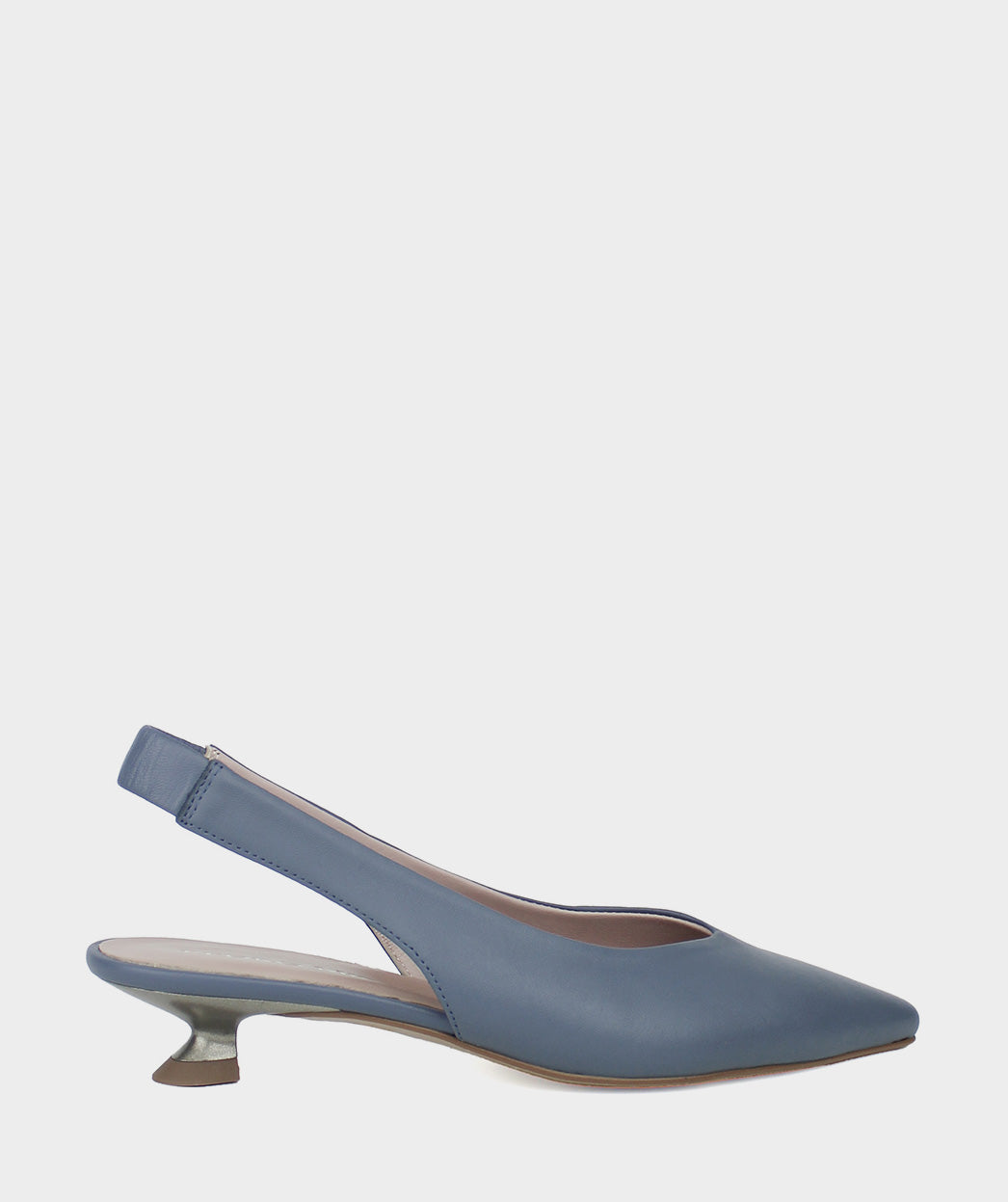 Zapatos de tacón bajo de piel de color azul. Un modelo perfecto para lucir durante todo el día cómodamente. Cuenta con una cinta elástica trasera para ajustarse cómodamente al pie.