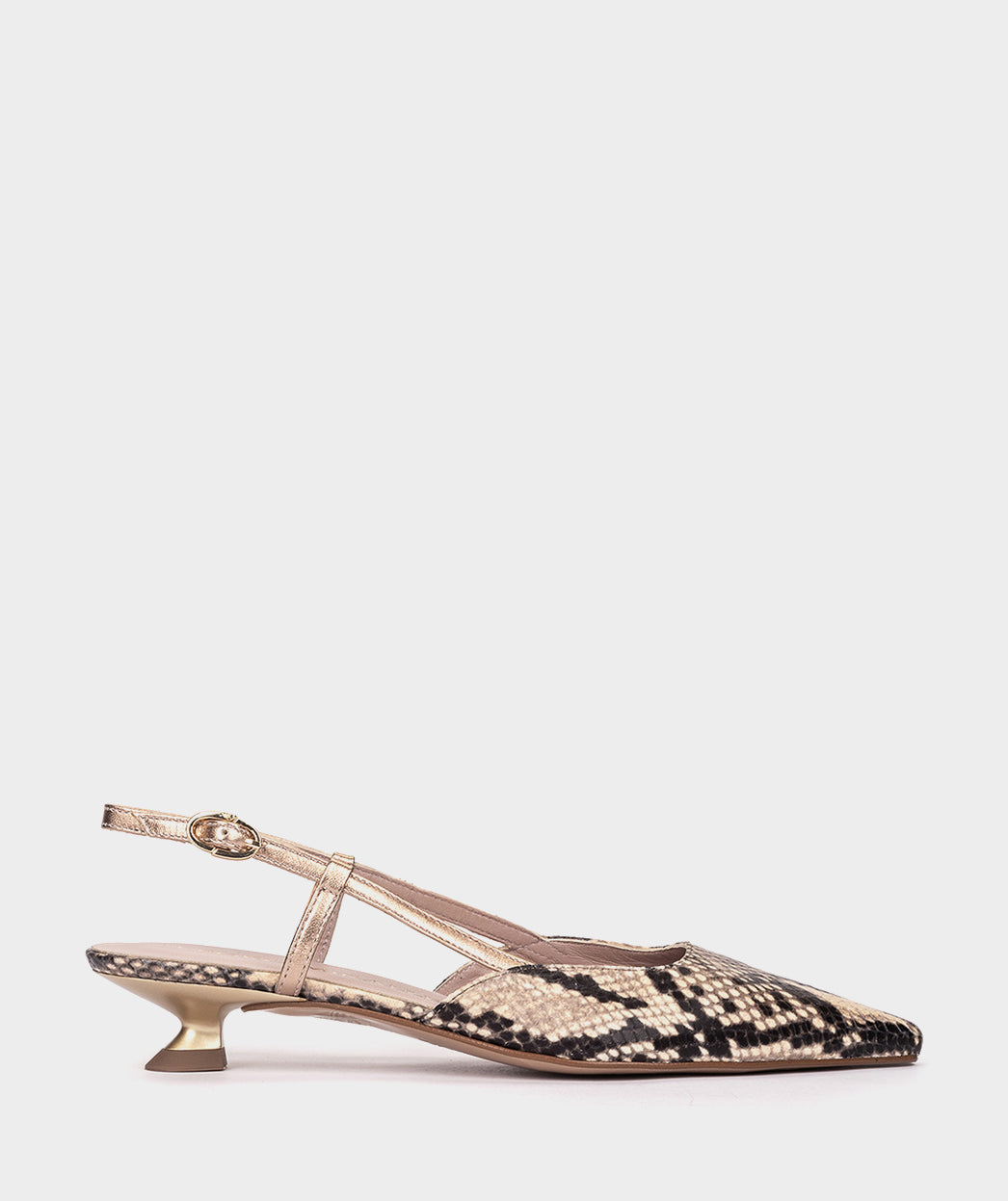 Zapatos destalonados de estampado de serpiente con tacón bajo. Un versión tan sofisticada como atrevida para seguir la tendencia del animal print esta temporada. La altura perfecta para lucir durante todo el día y elevar cualquier look.