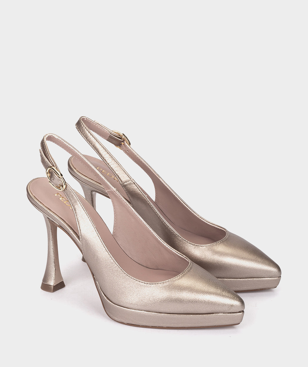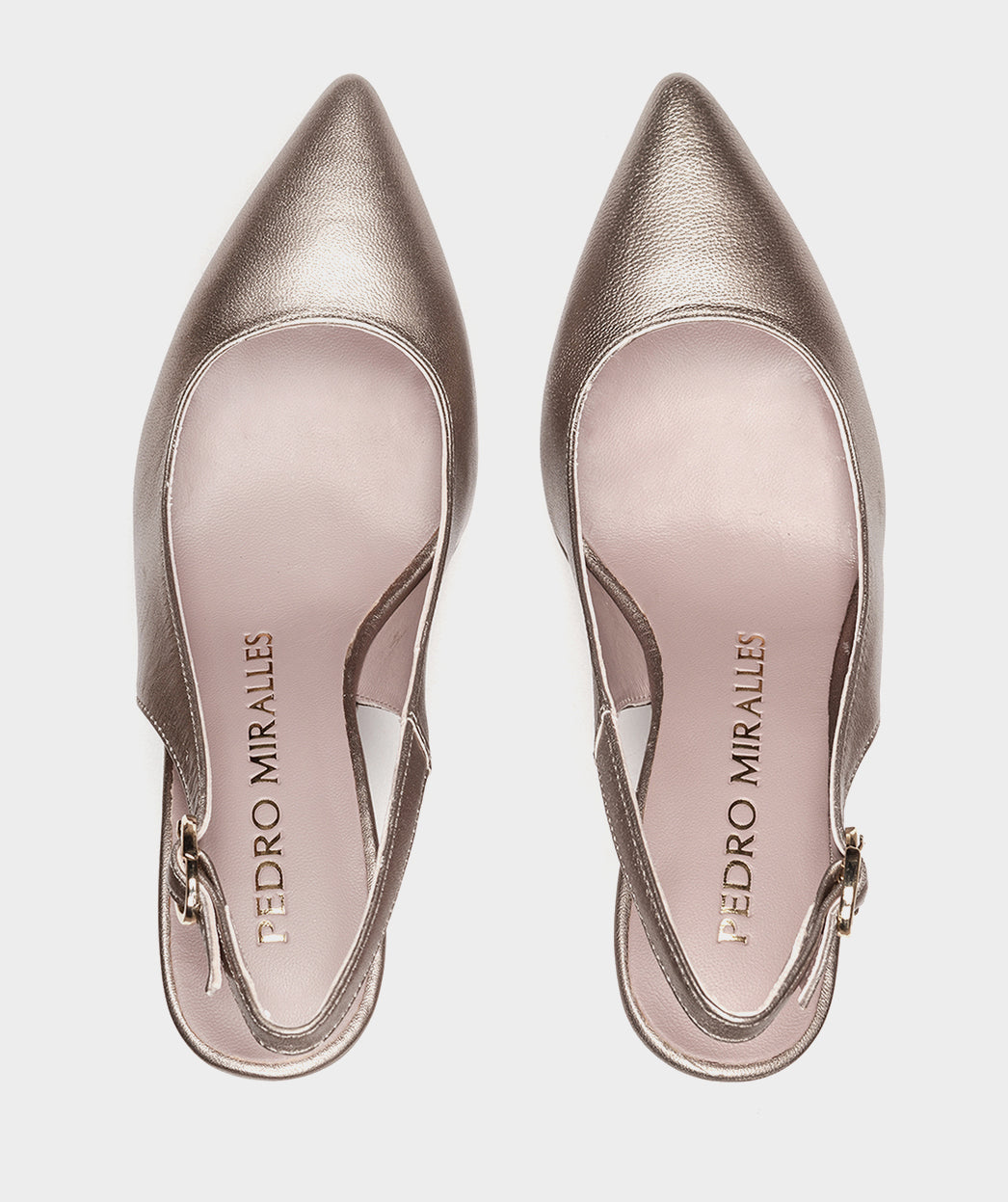 Zapatos de tacón de piel metalizada de color humo. El modelo Rena es una versión novedosa de nuestros emblemáticos salones que te proporcionará una altura elegante sin sacrificar el confort.
