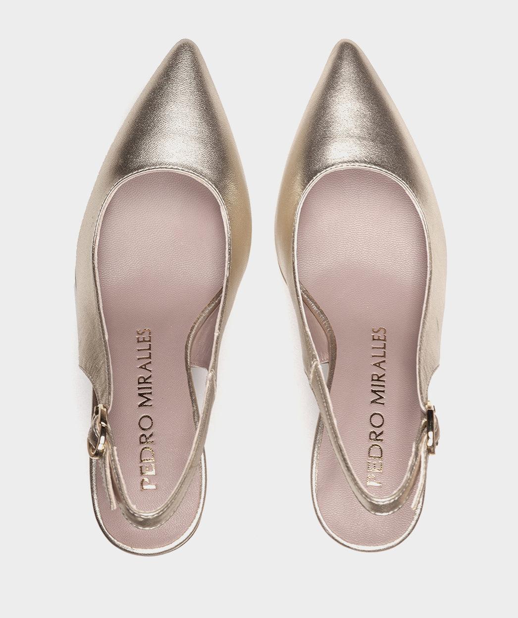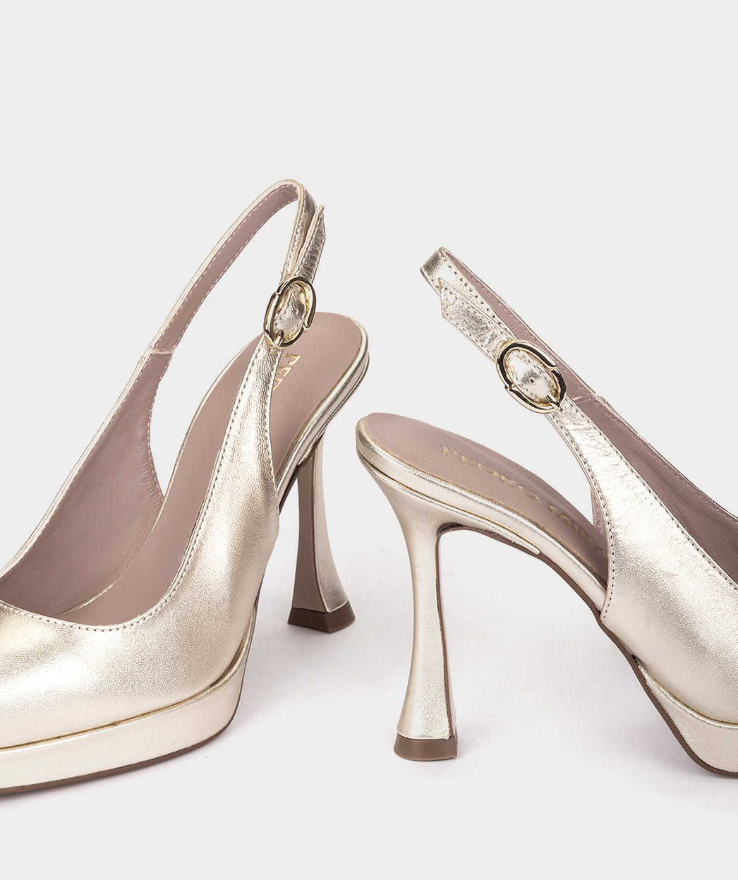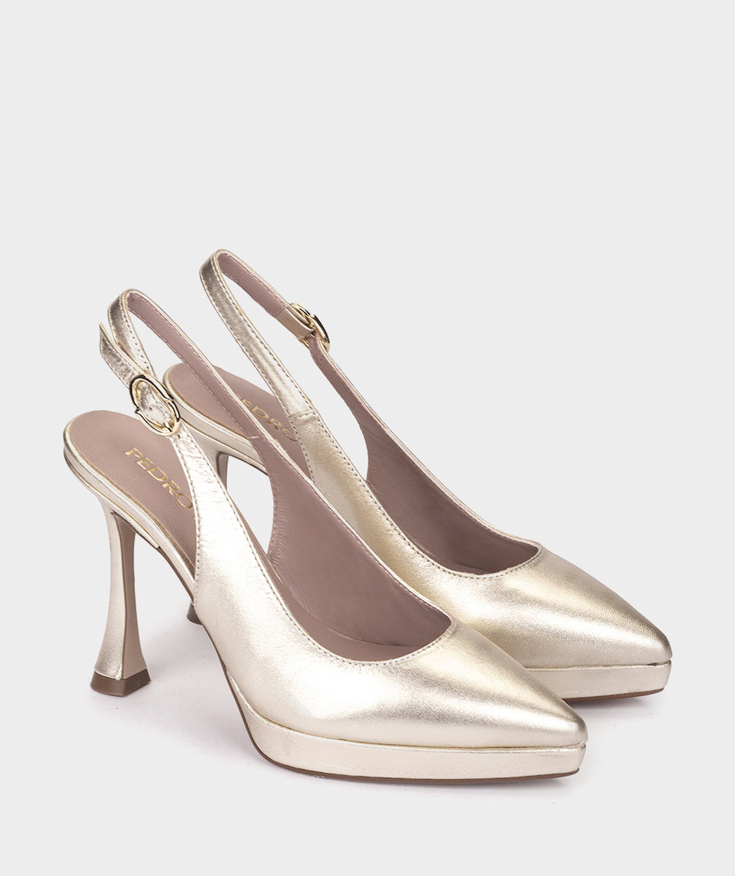 Zapatos de tacón de piel metalizada de color platino. El modelo Rena es una versión novedosa de nuestros emblemáticos salones que te proporcionará una altura elegante sin sacrificar el confort.