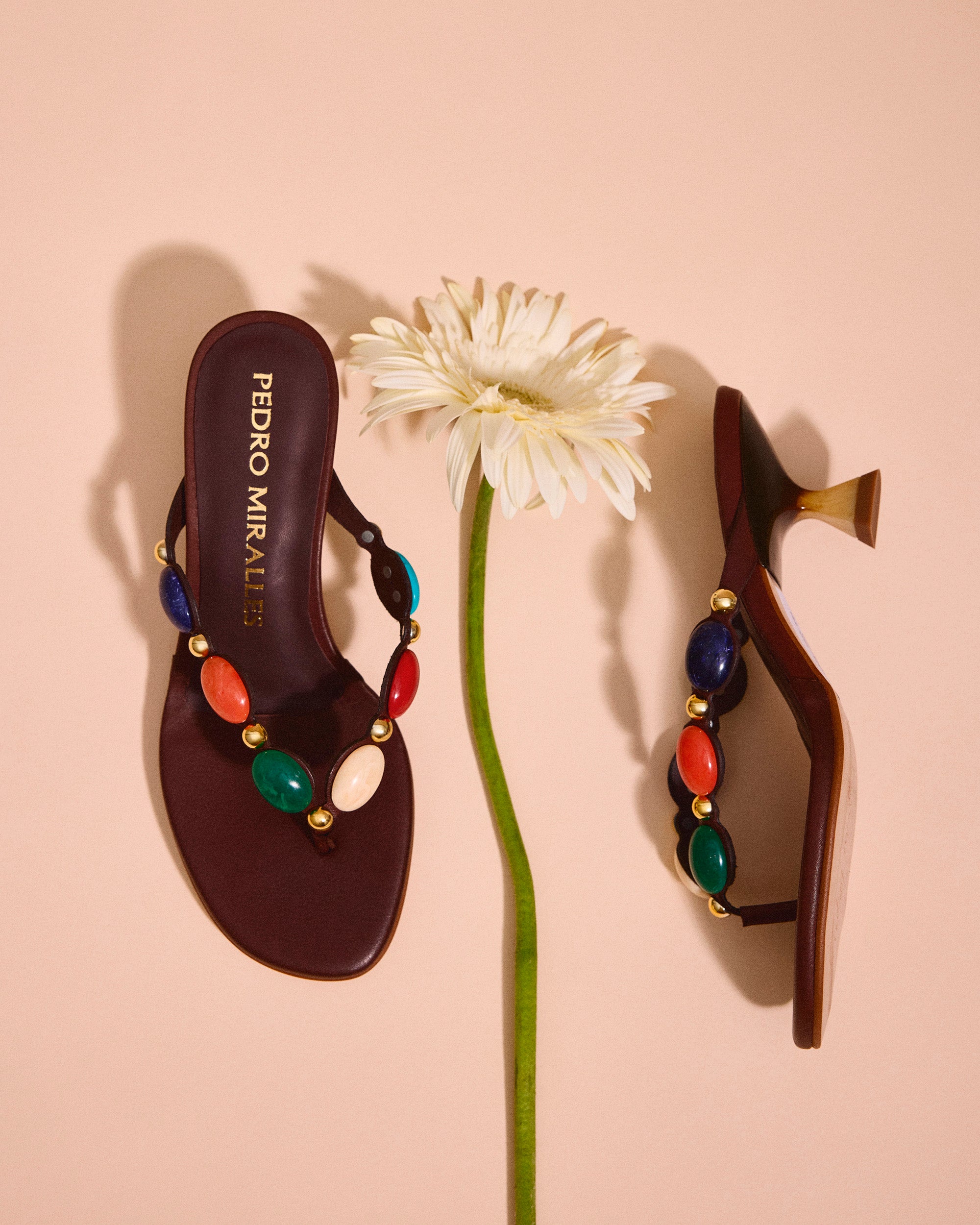Sandalias de tacón de piel marrón con piedras multicolor. Diseño especial y sofisticado, con tira en el empeine que realza el pie. Cómoda y elegante, es perfecta para elevar looks de día o noche con un toque original y distintivo de la nueva colección de Pedro Miralles.