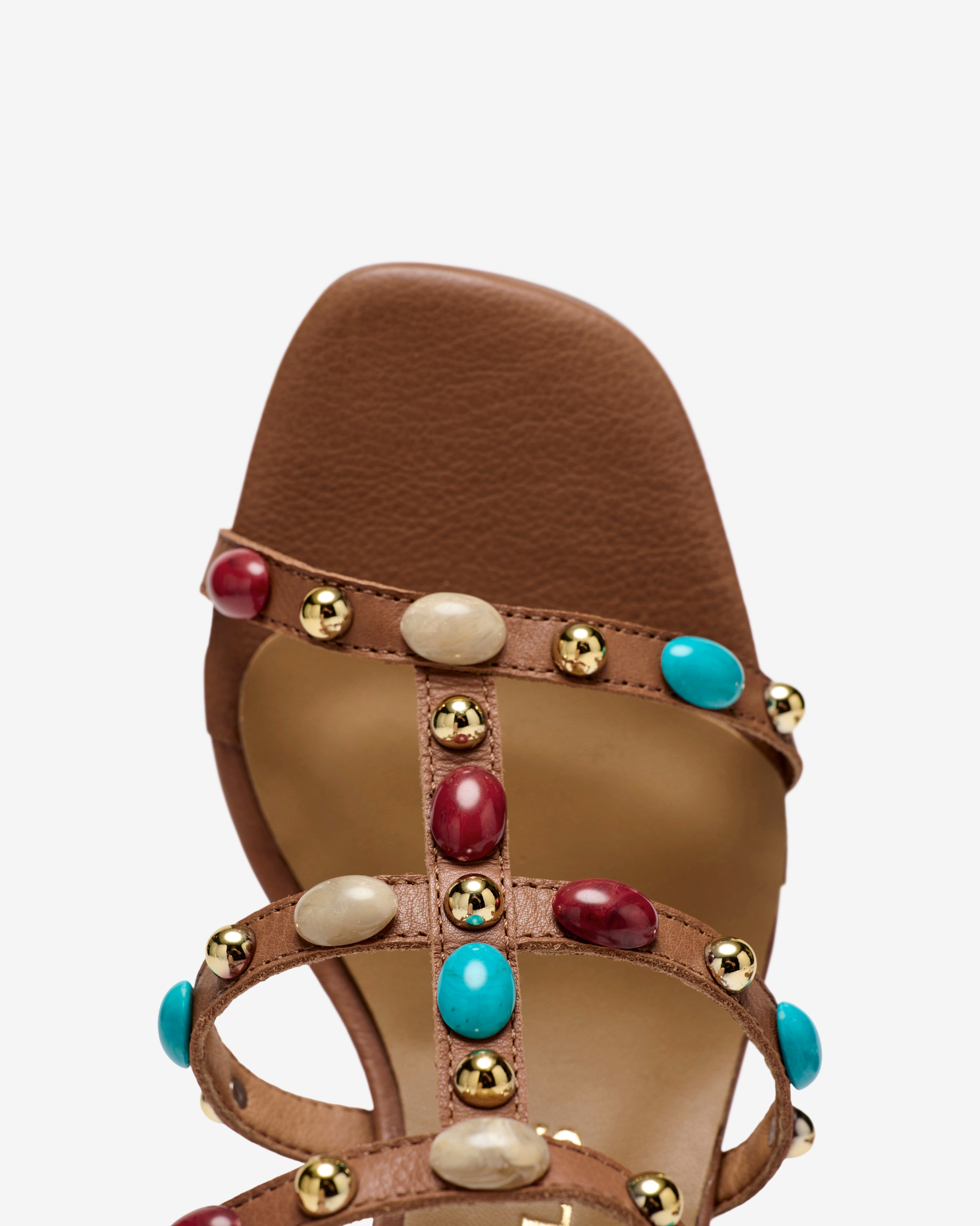 Sandalias de piel de color marrón con adorno piedras. Un modelo que combina comodidad y elegancia. Su silueta ofrece una perfecta adaptación y una óptima sujeción. Cuenta con planta acolchada para mejor amortiguación de la pisada.