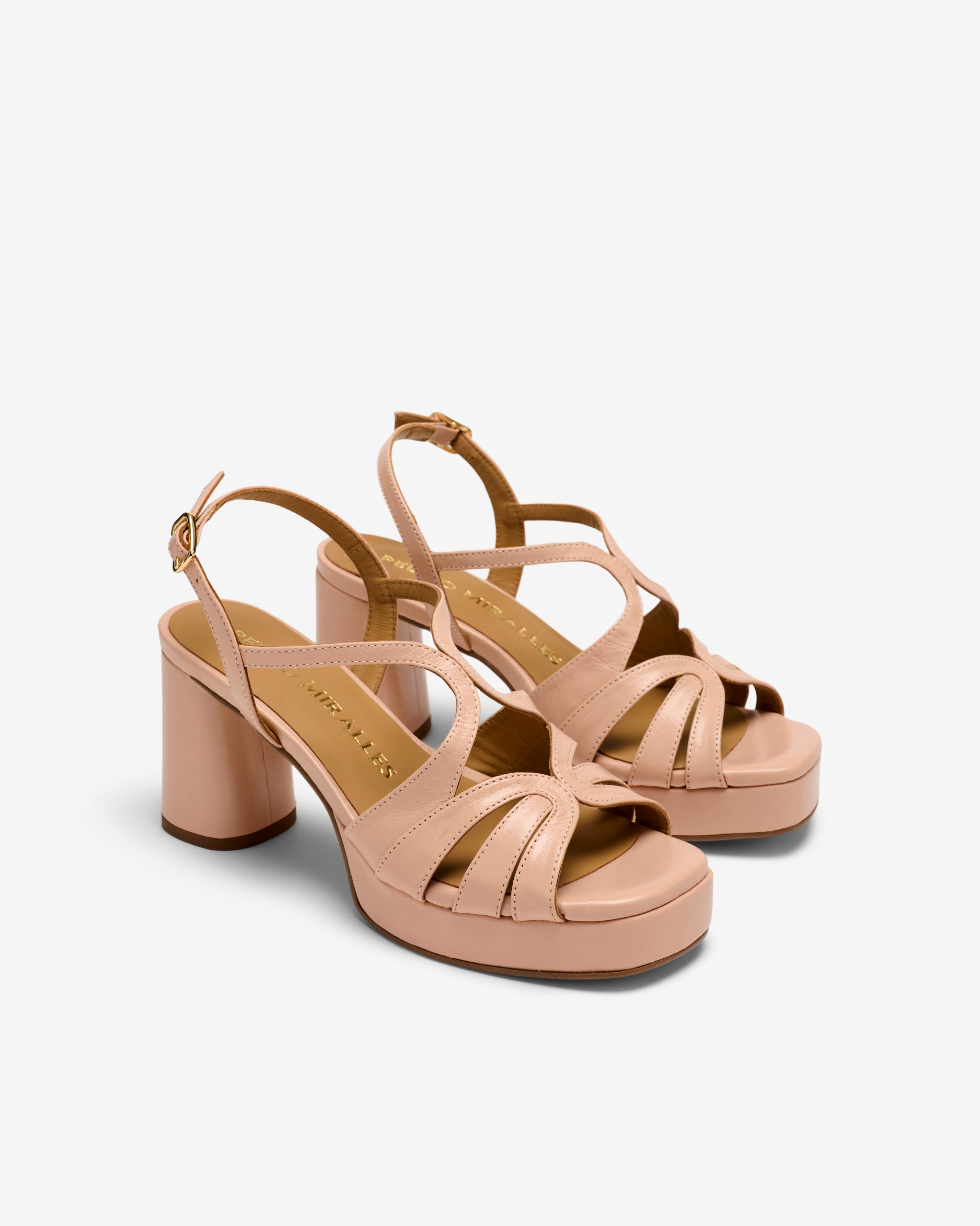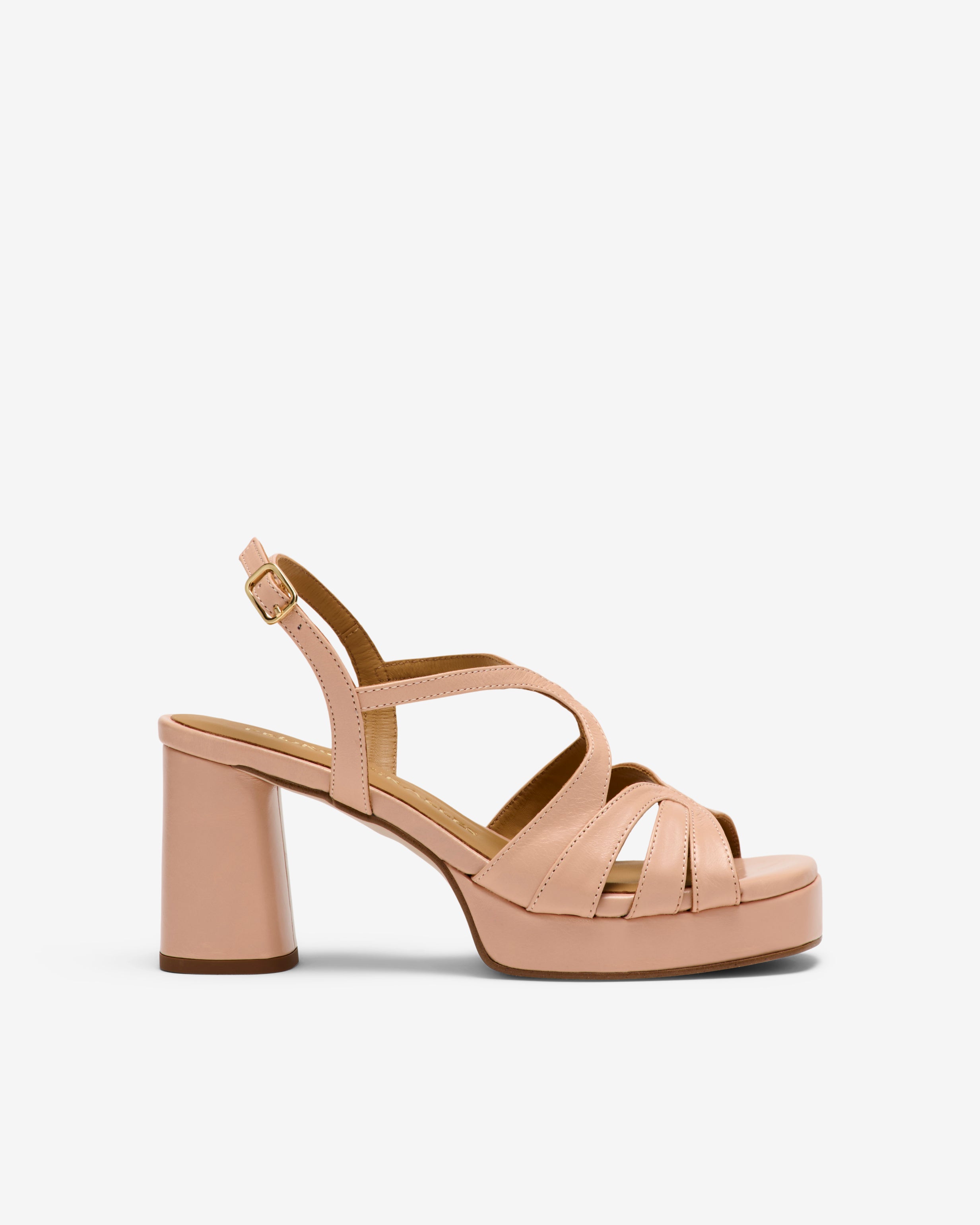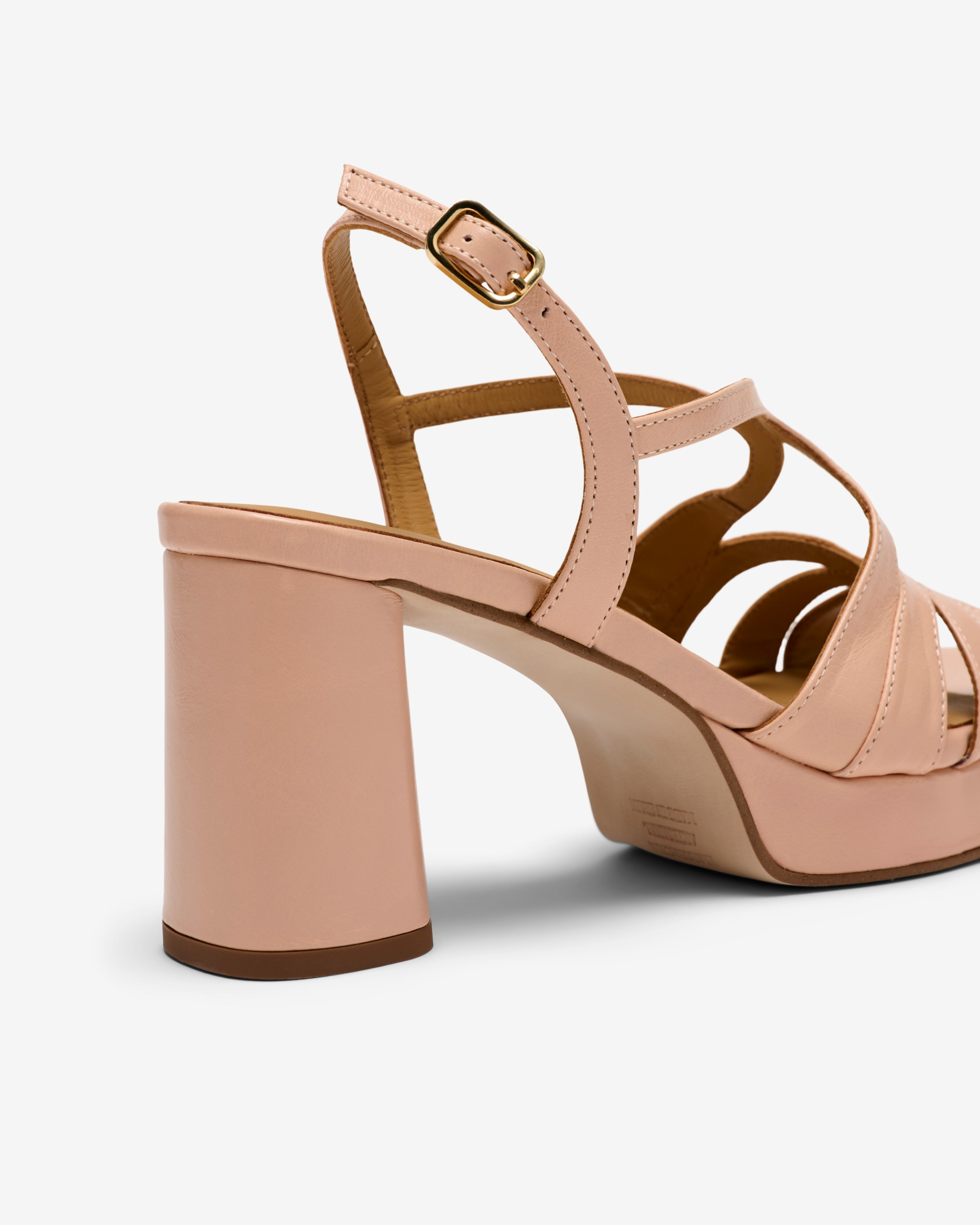 Sandalias de tacón de piel de color rosa palo. La versión del modelo MALAWI apta para quienes buscan un tacón más bajo. MANAUS es el modelo perfecto para lucir en eventos y ocasiones especiales.
