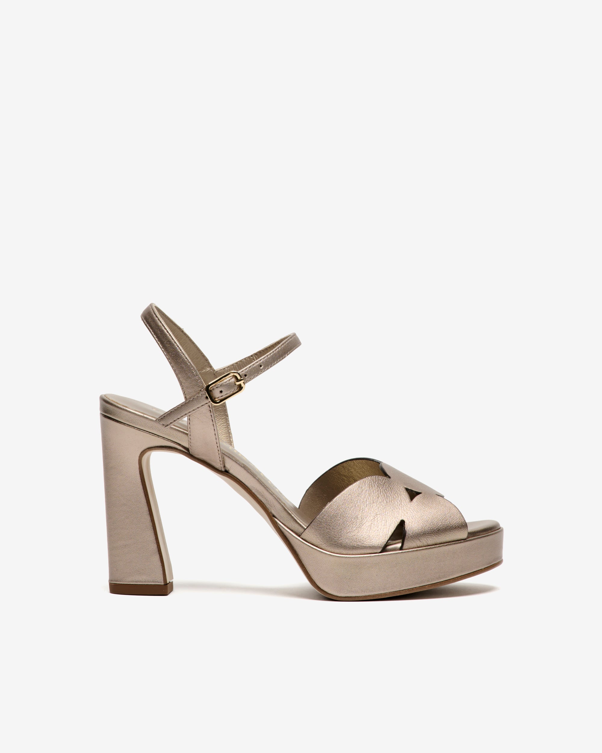 Sandalias de tacón con plataforma de piel metalizada. Una nueva versión del modelo BALI. Realza la silueta del pie por la confección de la pala con figuras geométricas. Cierre con pulsera al tobillo y hebilla de brillantes.