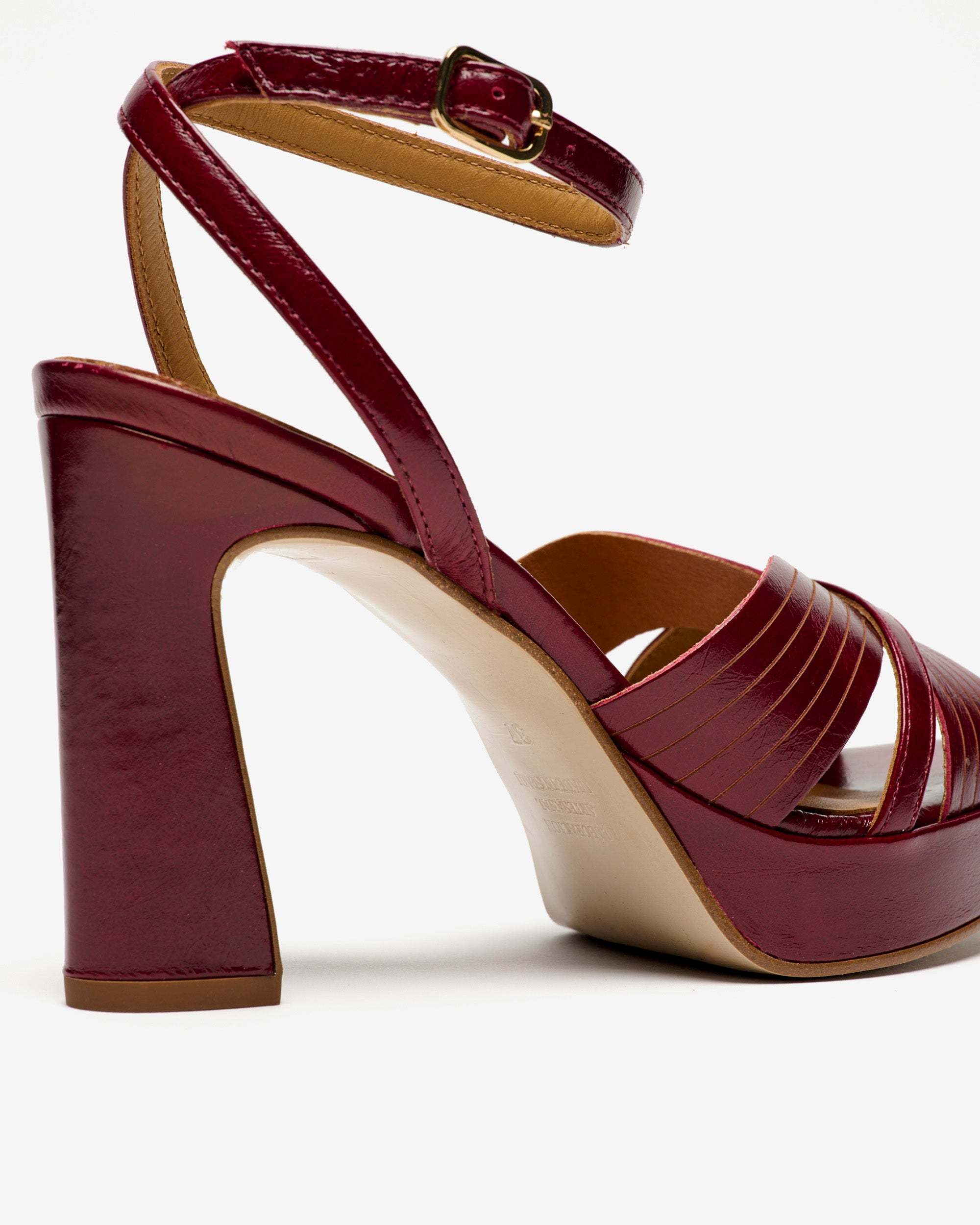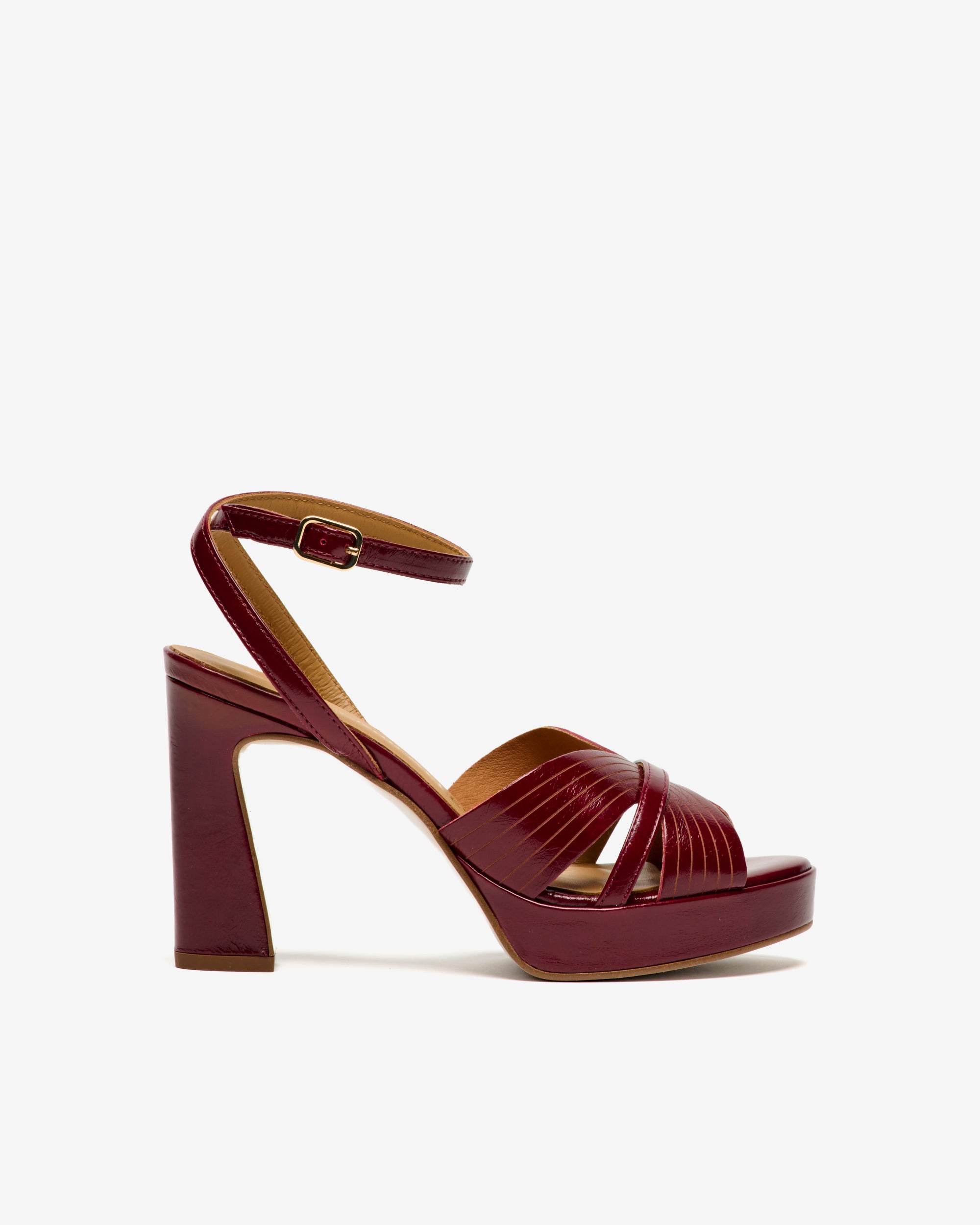 Sandalias de piel de color burdeos. Glamouroso diseño de tiras unidas para lograr un efecto acanalado. Serán el complemento perfecto de sus looks festivos.