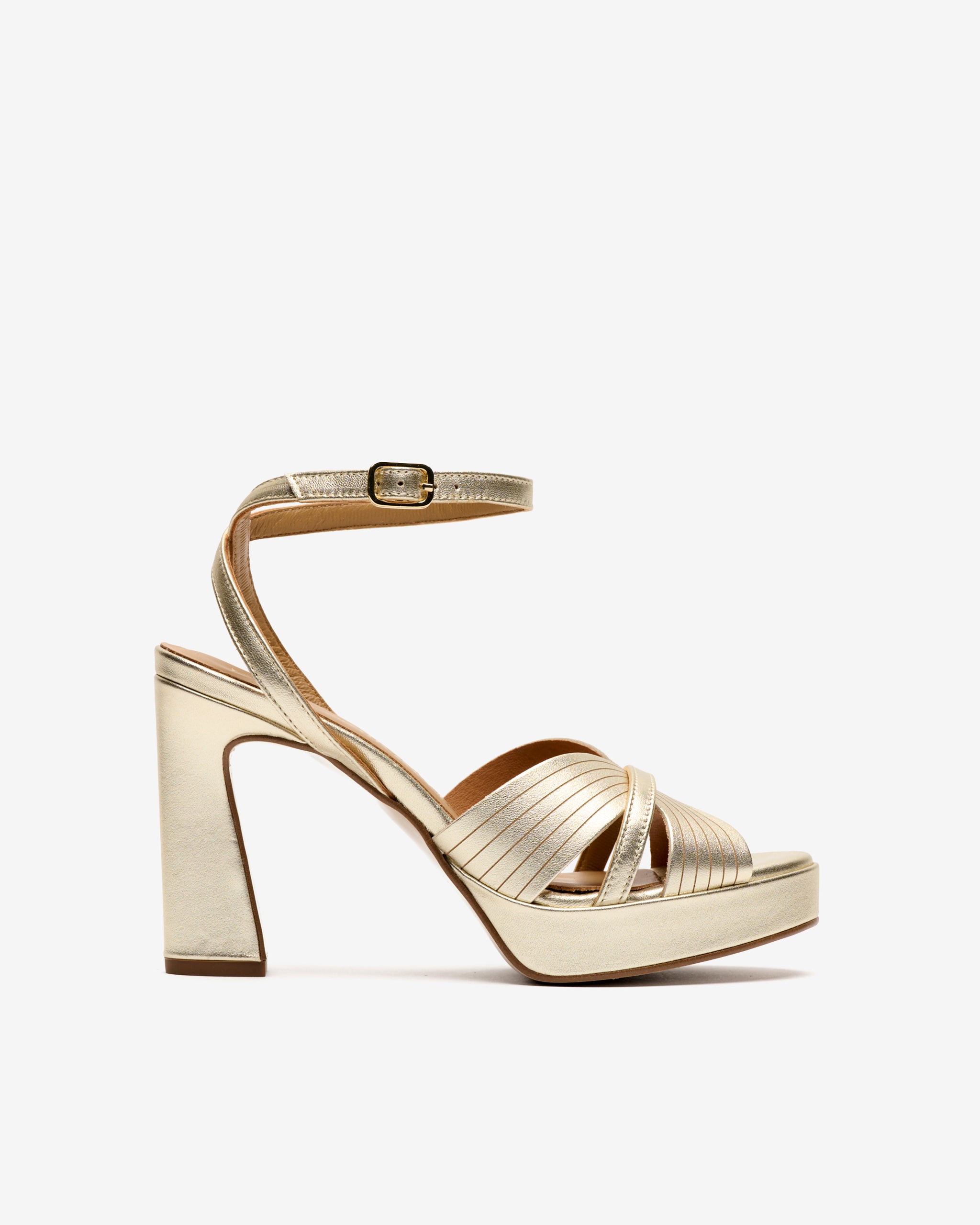 Sandalias de piel metalizada de color platino. Glamouroso diseño de tiras unidas para lograr un efecto acanalado. Serán el complemento perfecto de sus looks festivos.