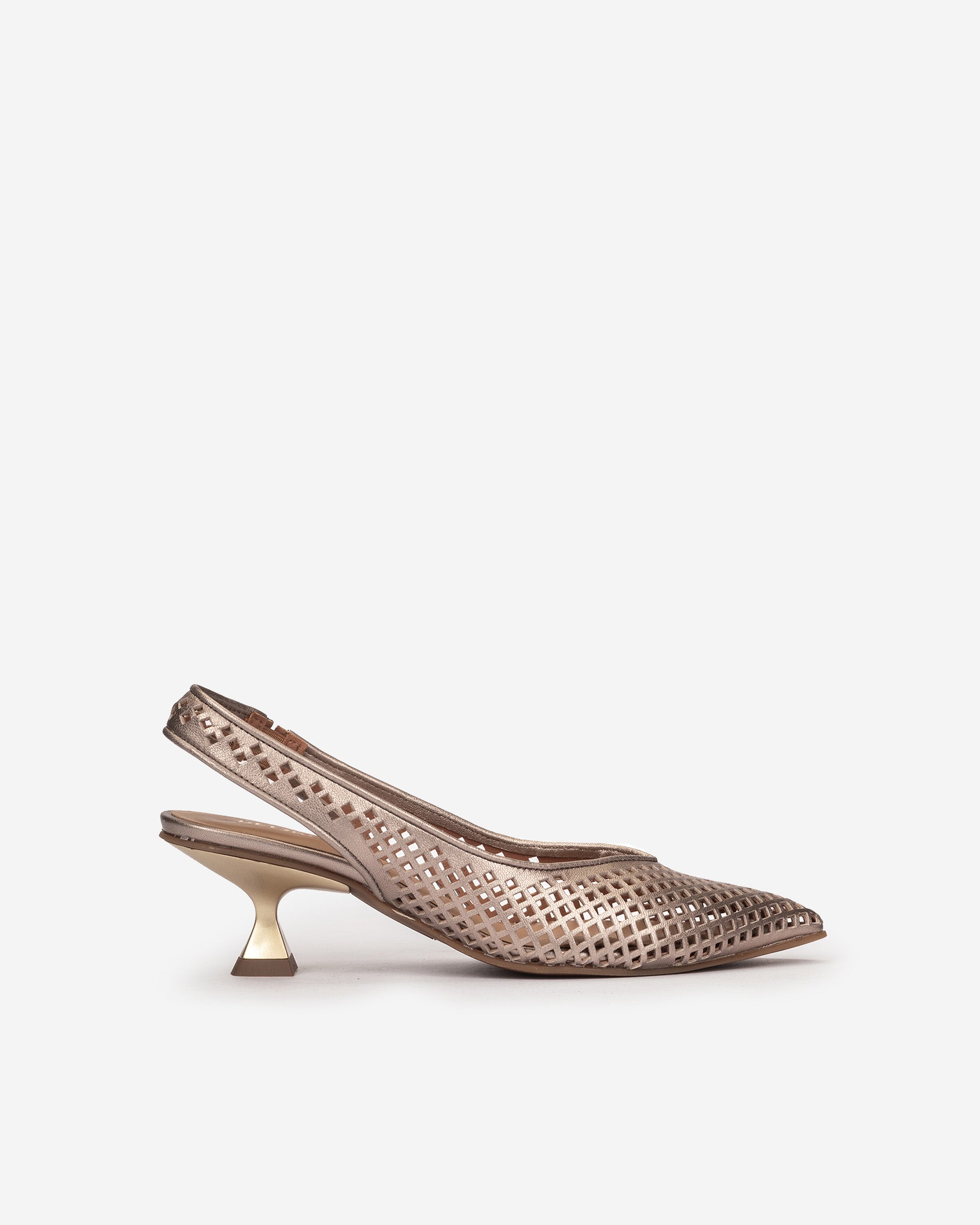 Zapatos de tacón destalonados de piel troquelada metalizada. Su silueta estilizadora y su cómodo tacón lo convierte en perfecto para lucir tanto a diario como en eventos. Cuenta con un elástico trasero que permite un óptimo ajuste.