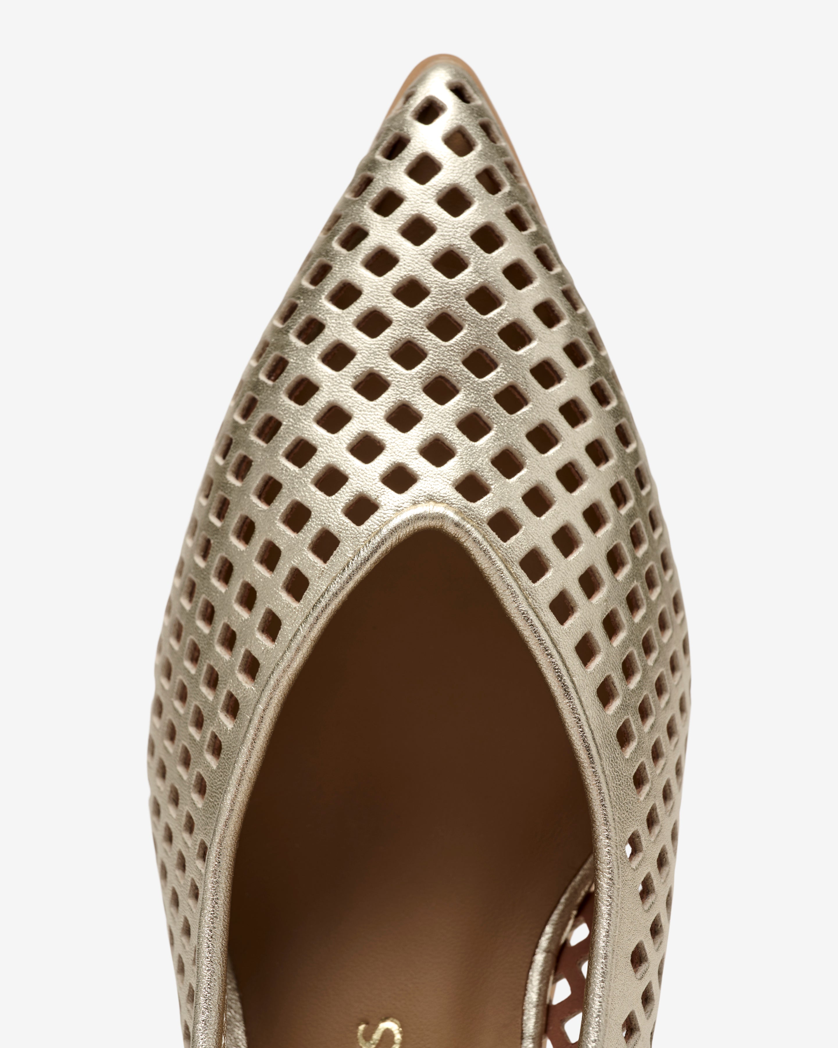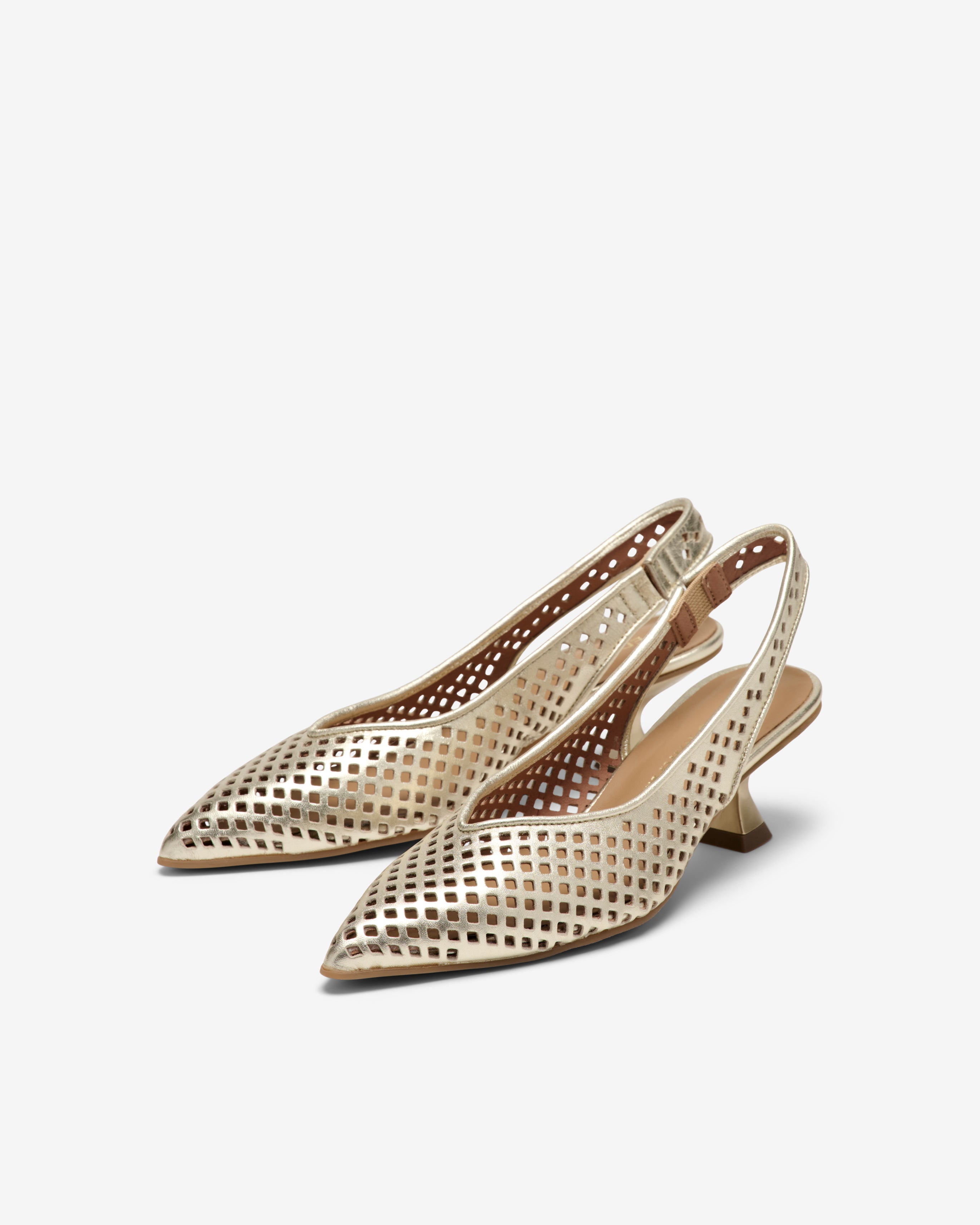 Zapatos de tacón destalonados de pie ltroquelada metalizada. Su silueta estilizadora y su cómodo tacón lo convierte en perfecto para lucir tanto a diario como en eventos. Cuenta con un elástico trasero que permite un óptimo ajuste.