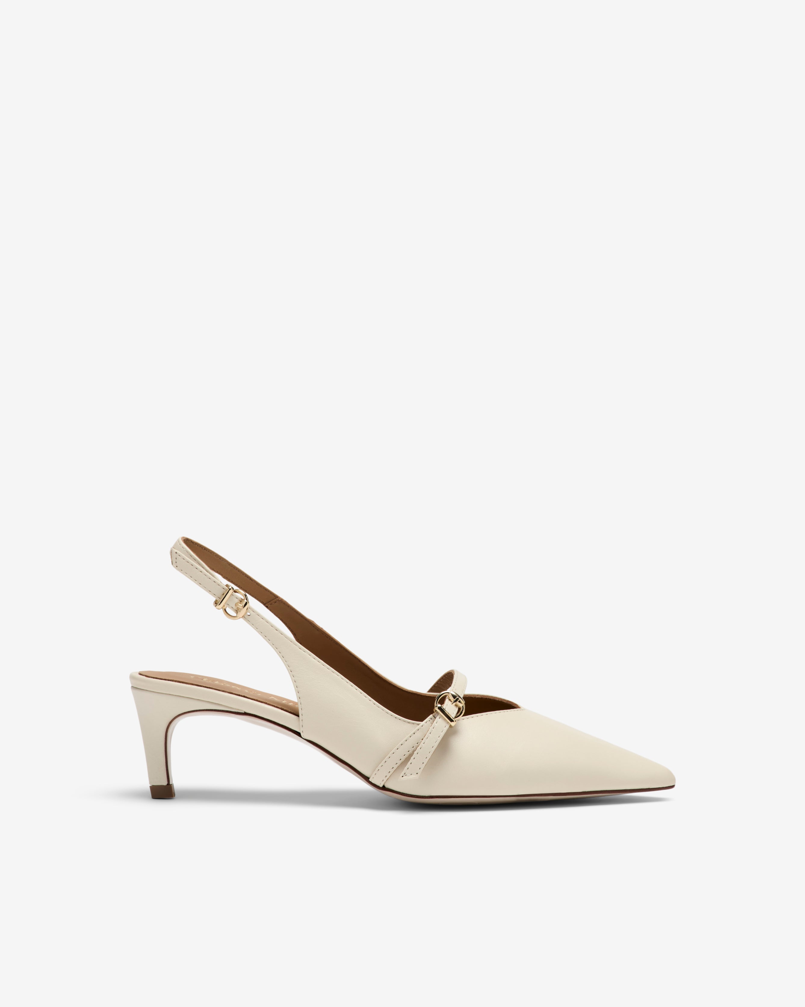 Zapatos de tacón destalonados de piel de color blanco. Diseño en punta fina que estiliza la silueta y aporta sofisticación. Destaca su detalle decorativo con piedras multicolor y aplicaciones doradas sobre el empeine. Acabado en piel lisa, cómodo y femenino, ideal para eventos o looks de oficina refinados.