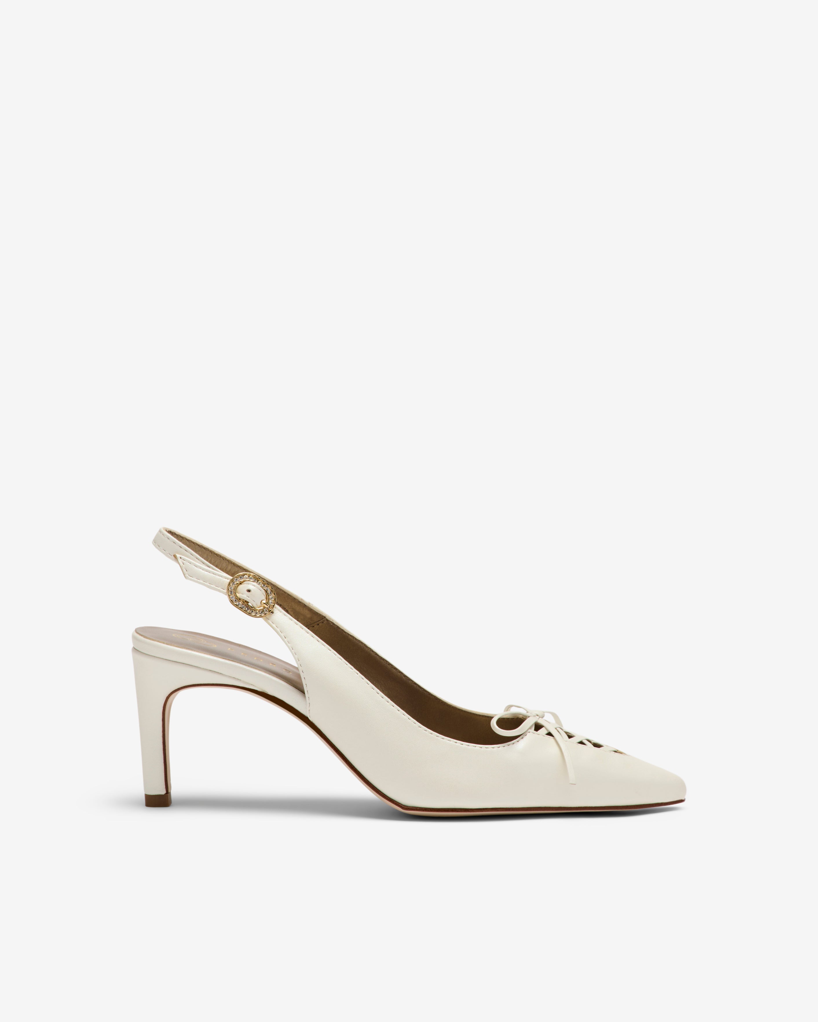 Zapatos destalonados de tacón de piel de color blanco. Un modelo que destaca por su escote con delicado lazo entrelazado que aporta un toque sofisticado y original. Diseño estilizado con puntera fina que realza la silueta del pie. Un diseño original para el día de tu boda.