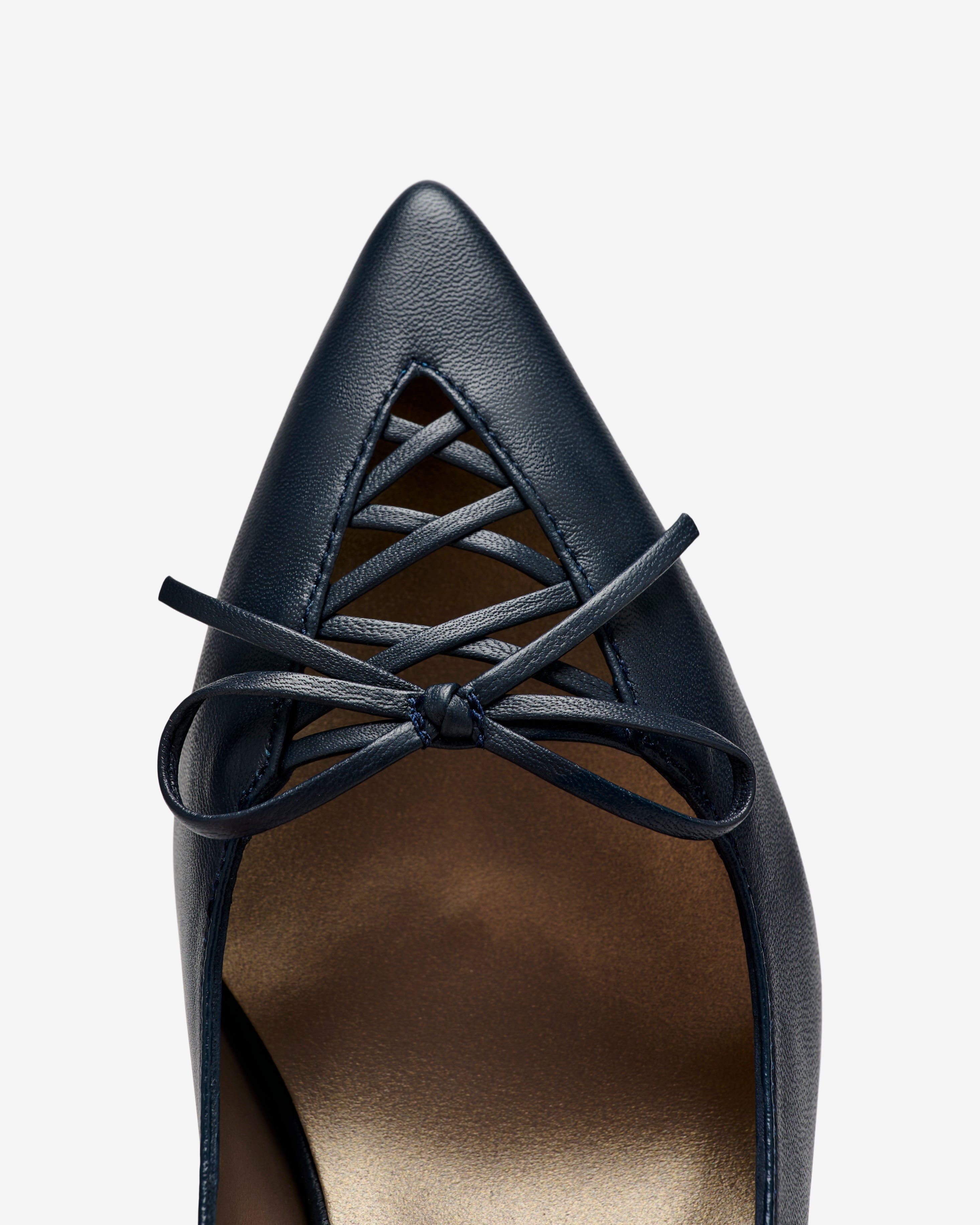 Zapatos destalonados de tacón de piel de color azul. Un modelo que destaca por su escote con delicado lazo entrelazado que aporta un toque sofisticado y original. Diseño estilizado con puntera fina que realza la silueta del pie. Su tacón fino combina comodidad y elegancia para el día a día.