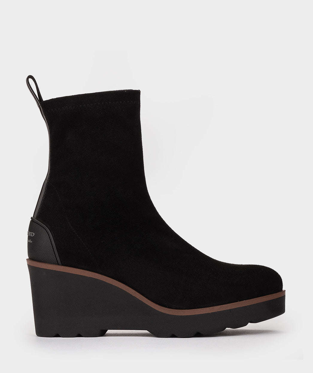 Botines de tejido elástico efecto ante de color negro. Los botines HITA están confeccionados con nuestro popular tejido elástico para un ajuste óptimo. Este modelo básico y atemporal se convertirá en un imprescindible de tu armario.