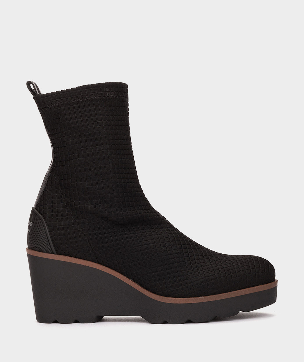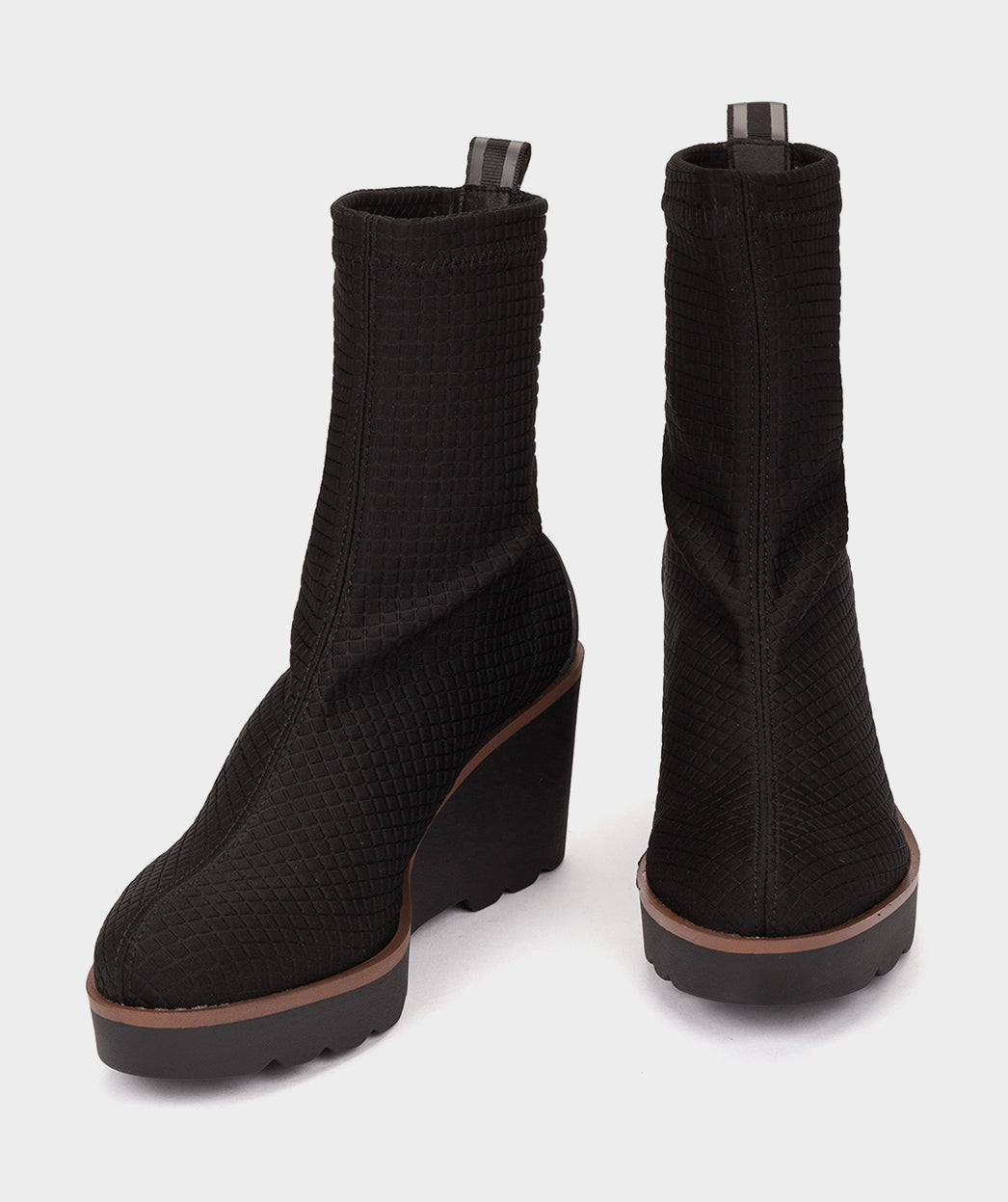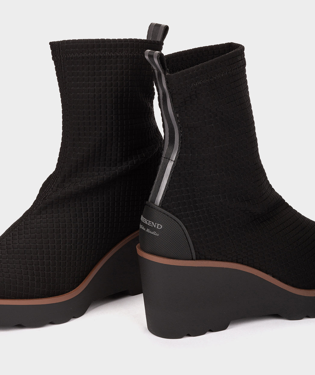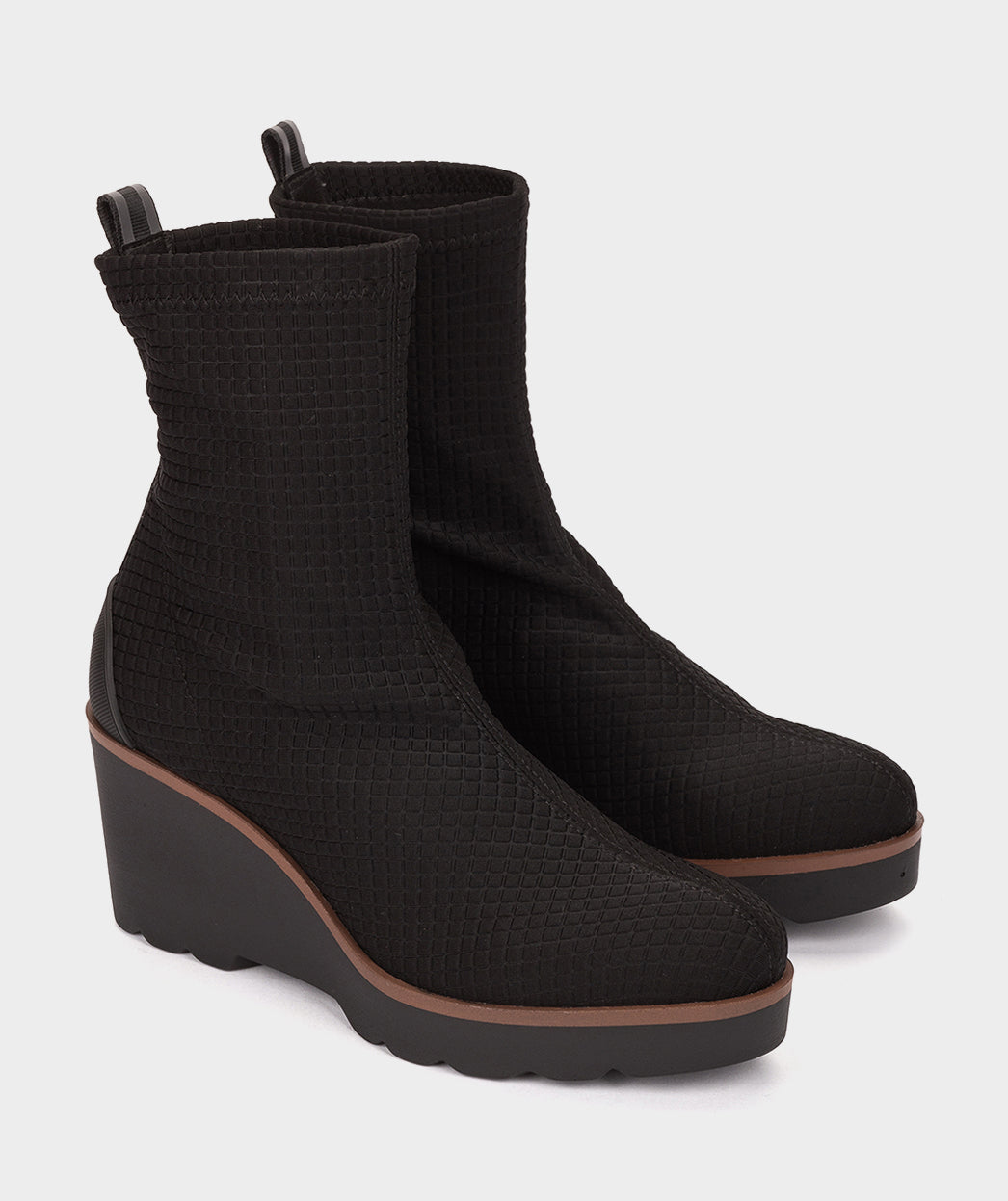 Botines de tejido elástico con textura en color negro. Los botines HITA están confeccionados con nuestro popular tejido elástico para un ajuste óptimo. Este modelo básico y atemporal se convertirá en un imprescindible de tu armario.