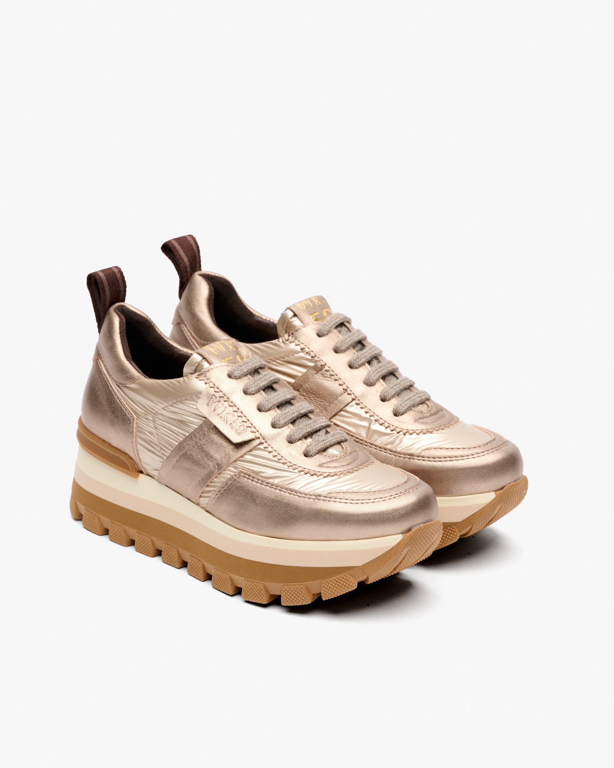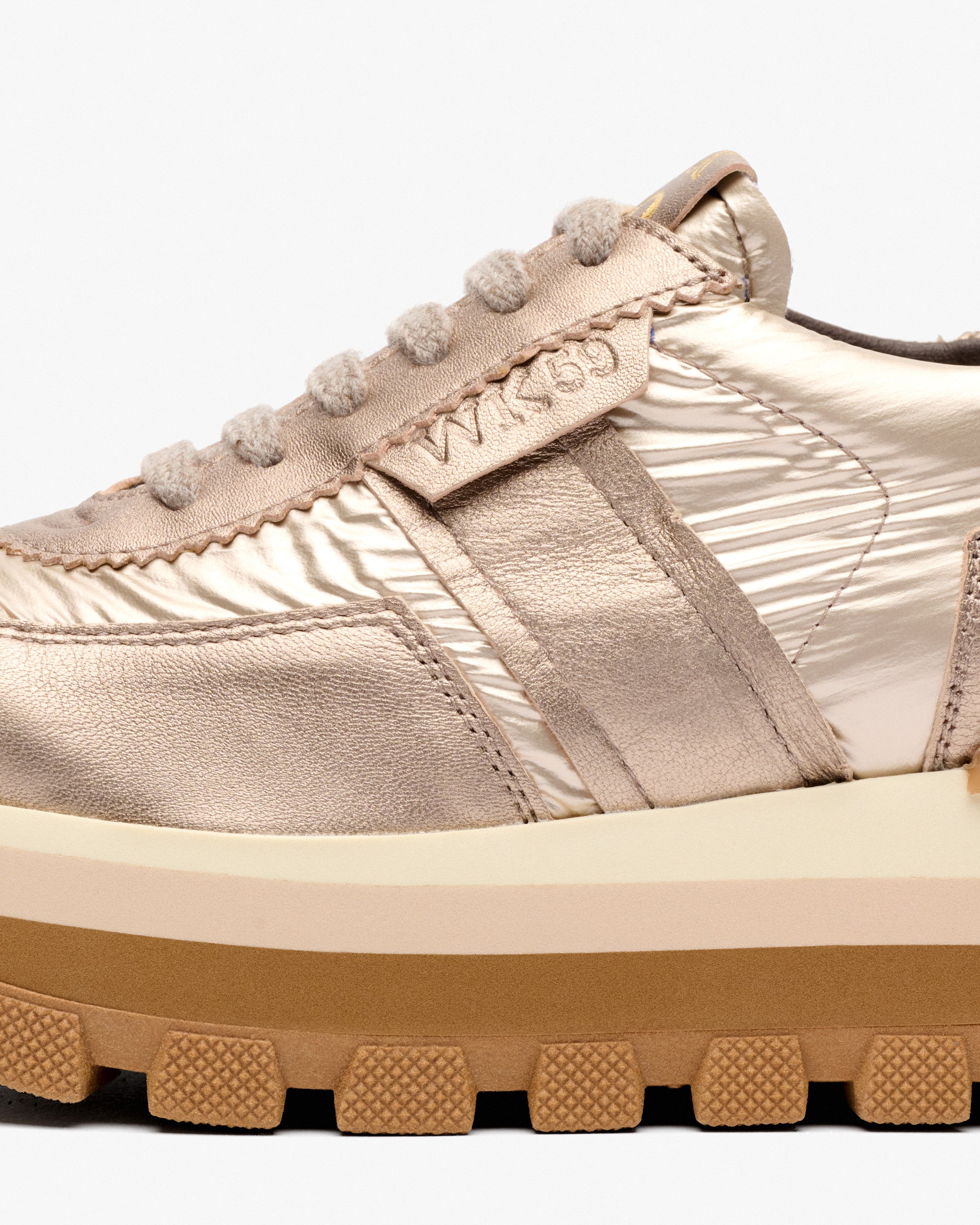 Zapatillas deportivas de tejido metalizado. Pensado para las amantes del calzado deportivo más atrevidas, nuestro modelo GORDES se convertirá en su favorito de la temporada de invierno. Su diseño cuenta con detalles como la combinación de tejidos, los cordones elásticos y una plataforma tricolor; dando como resultado un modelo de 10. Cuenta con plantilla extraíble.