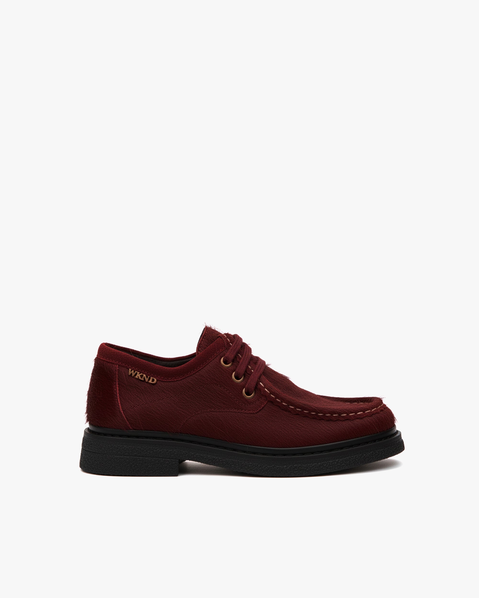 Zapatos planos de pelo de color burdeos con cordones. Un modelo que reinventa la forma clásica del zapato Oxford y le aporta un toque moderno, gracias al piso rugoso y a las costuras que adornan la pala.