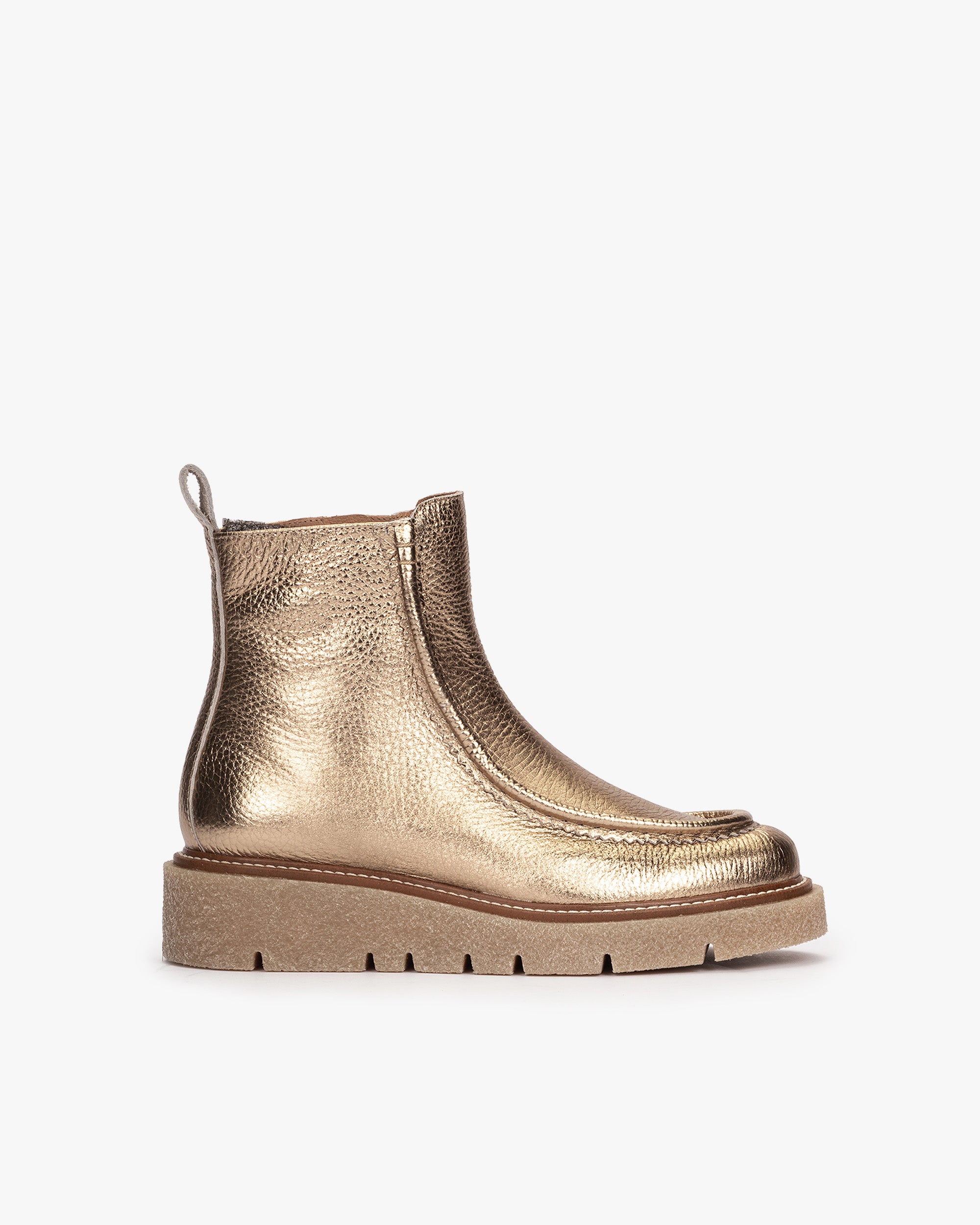 Botines de piel metalizada de color platino. Un diseño versatil pensado para lucir a diario. El detalle de la costura sobre la silueta le aporta distinción y originialidad. La rugosidad de la suela permite un óptimo agarrre al piso.