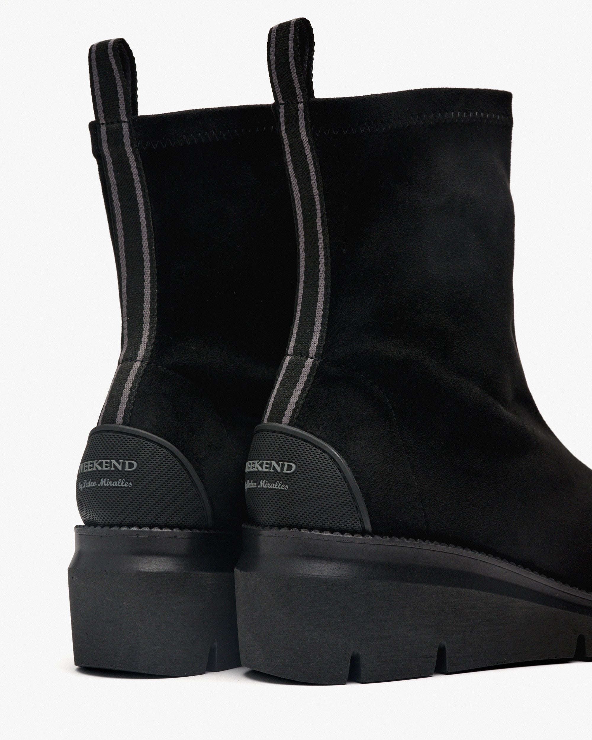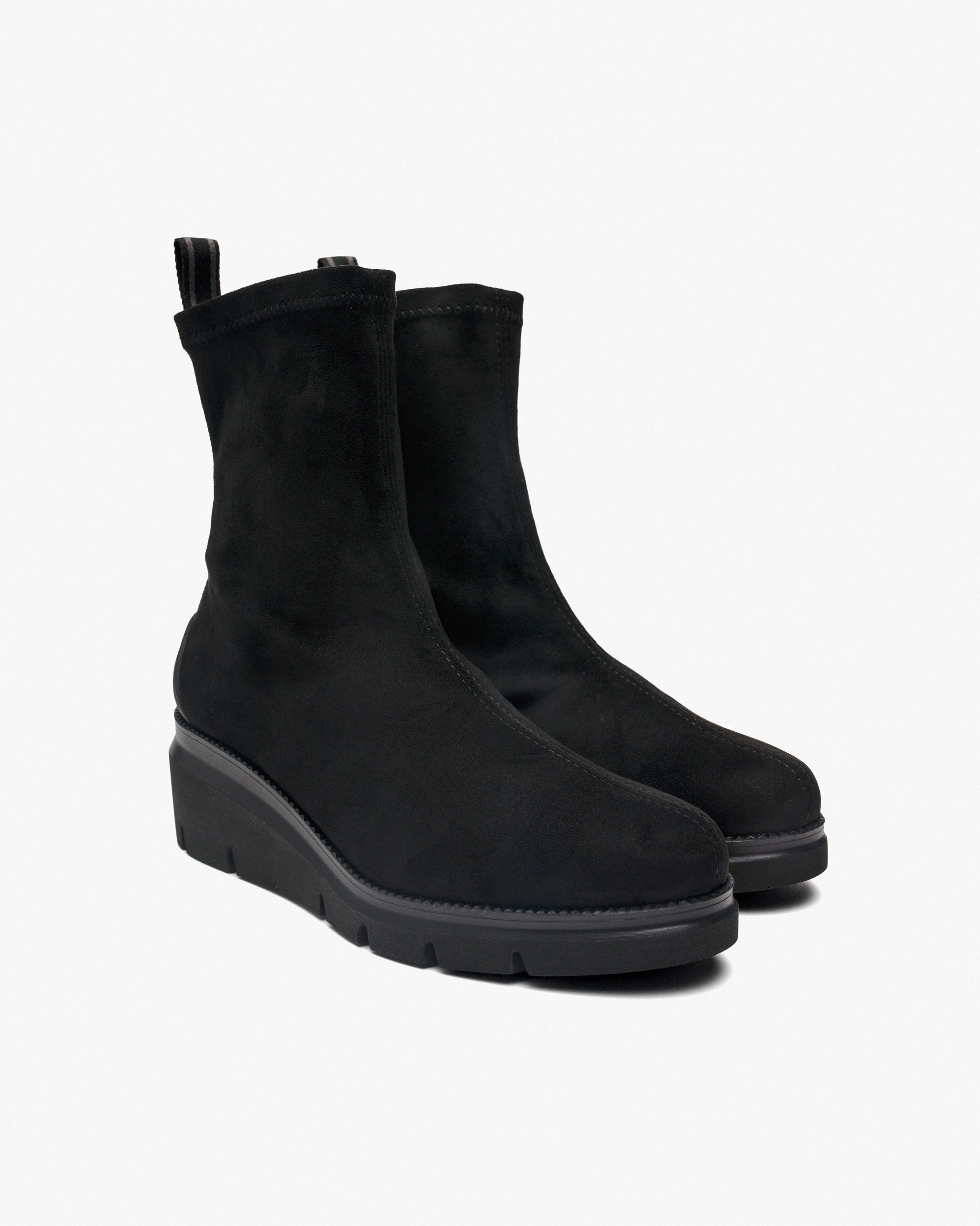 Botines de tejido elástico efecto ante de color negro. Los botines con plataforma de ante elástico combinan elegancia y comodidad. Una opción moderna y chic para aportar un toque casual a tus outfits.