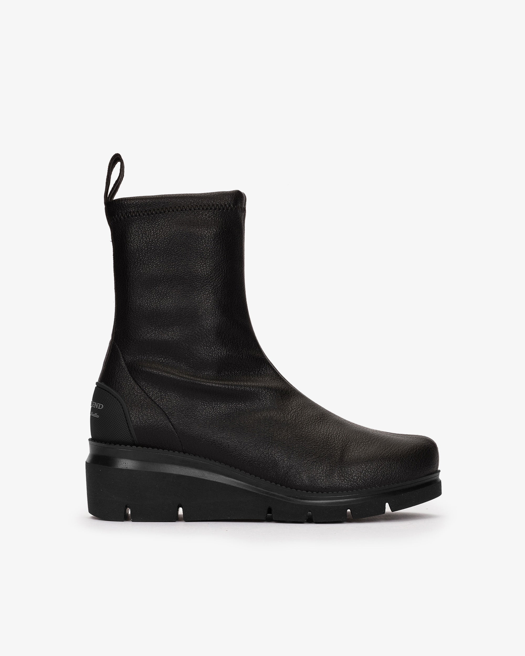 Botines de tejido elástico efecto piel de color negro. Su tejido y silueta permite calzarlos cómodamente, además de ofrecer un ajuste óptimo. Los botines con plataforma de ante elástico combinan elegancia y comodidad. Una opción moderna y chic para aportar un toque casual a tus outfits.