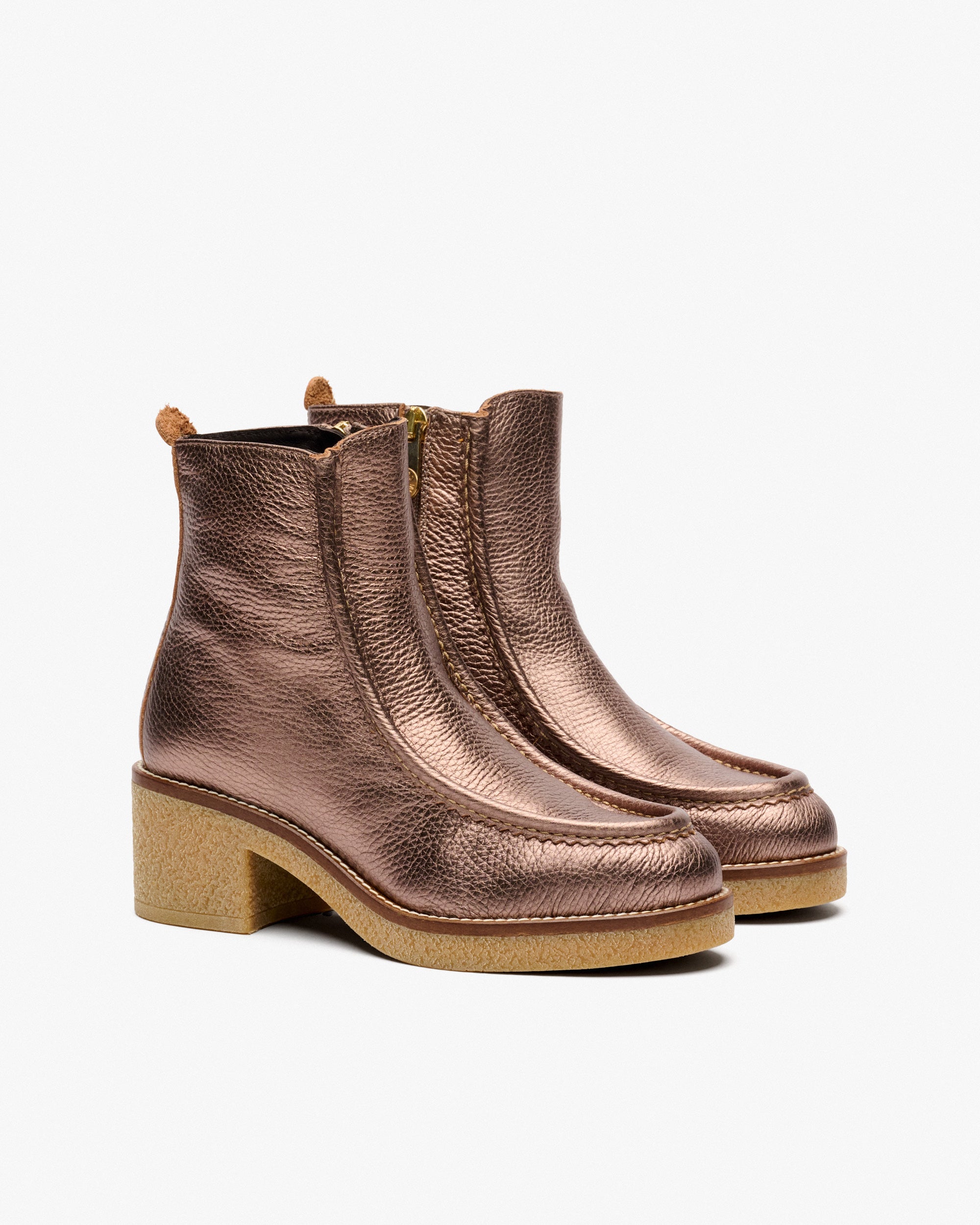 Botines de piel metalizada de color bronce. Un diseño todoterreno pensado para lucir durante todo el día. Su piso y tacón rugosos destacan por su agarre antideslizante. El detalle de la costura sobre el empeine eleva la originalidad del modelo.