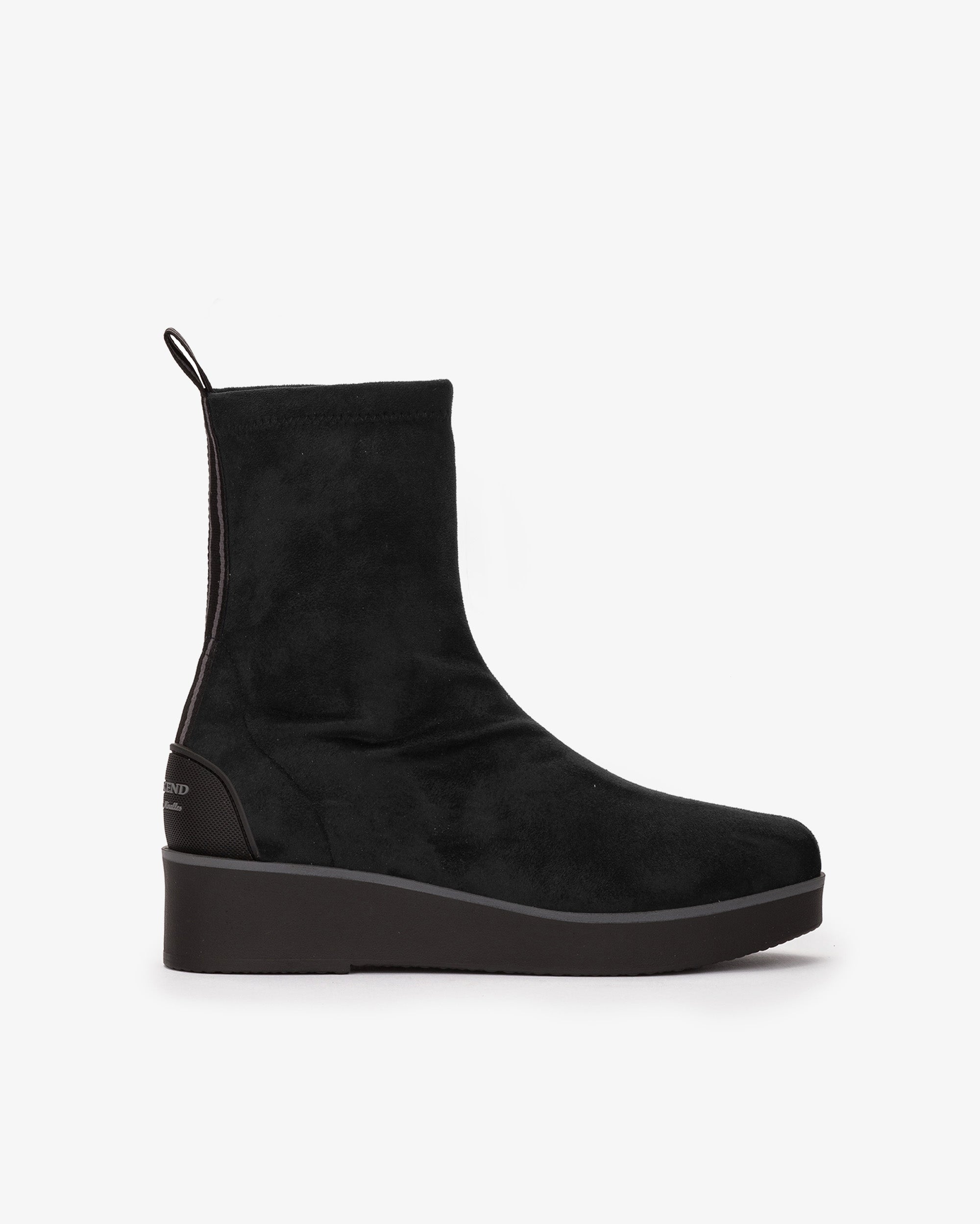Botines de tejido elástico efecto ante de color negro. Su acabado efecto cuero les da un aspecto elegante y moderno. El tejido ajustado se adapta a la forma del pie y el tobillo, brindando comodidad y estilo. Su horma ancha garantiza un ajuste espacioso y agradable incluso después de horas de uso.
