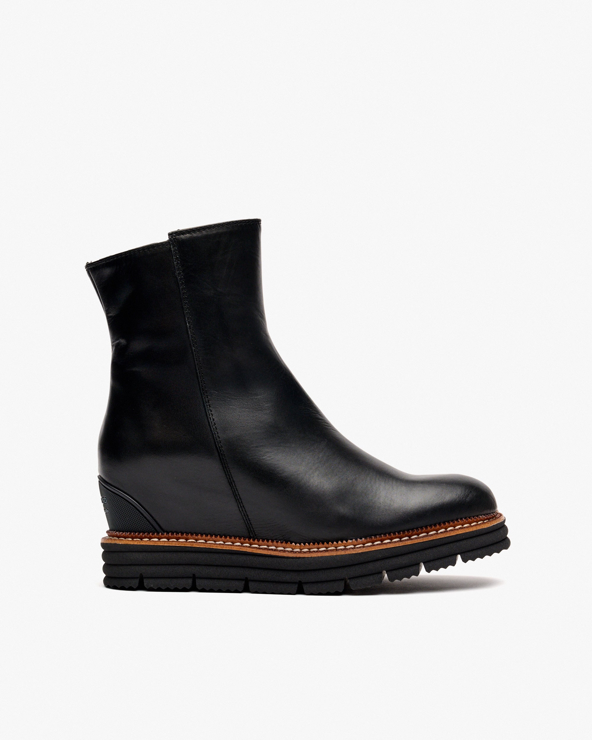 Botines de piel de color negro con cuña interior. Un modelo original y versátil, perfecto para lucir en la temporada de invierno. Cuenta con cremallera lateral para calzarlo fácilmente. Su cuña interior es la clave de su éxito.