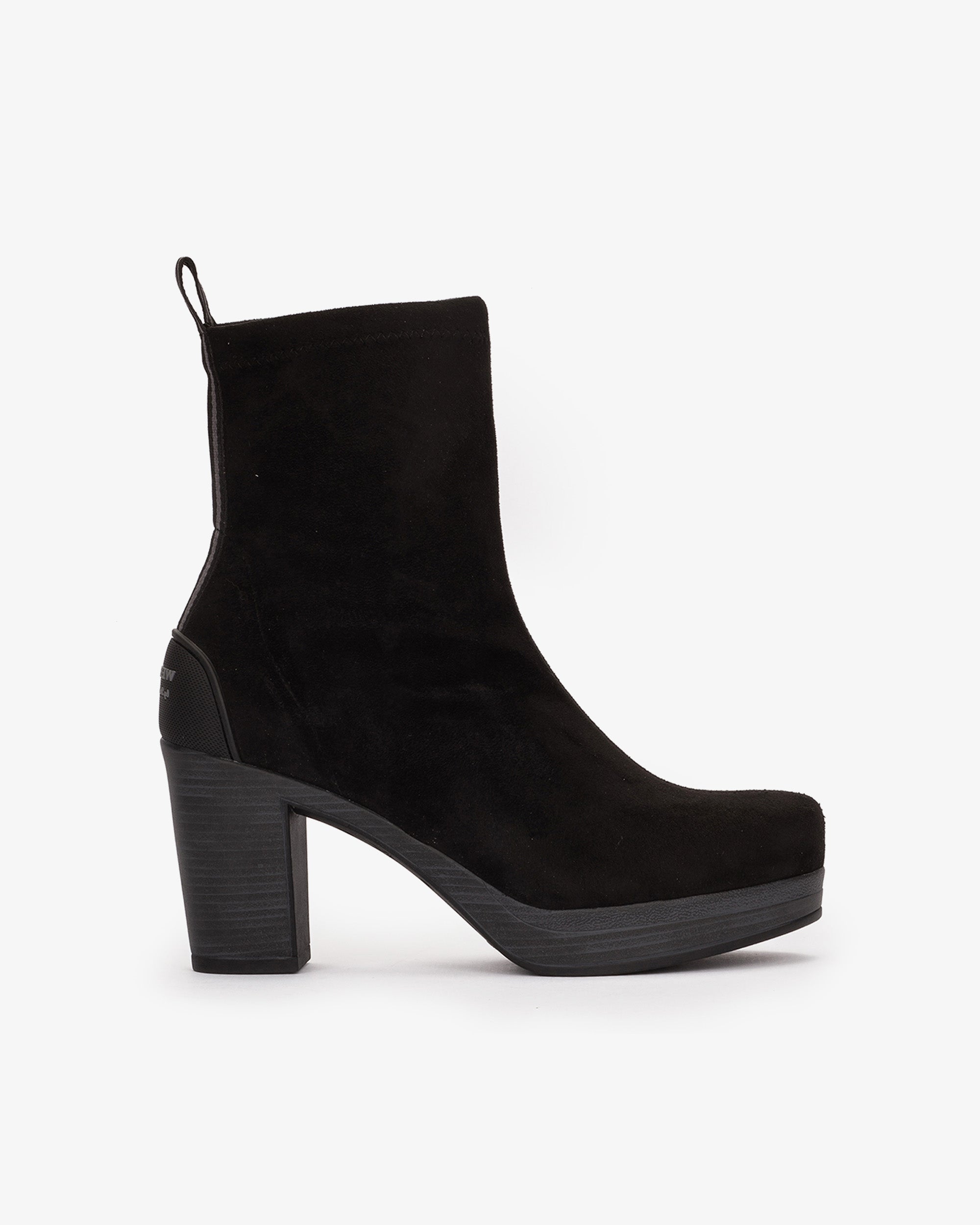 Botines de tejido elástico efecto ante de color negro. La silueta del modelo ofrece una sujeción óptima, además de estilizar el pie, gracias a su original puntera y a la altura del tacón. El tejido elástico ofrece un ajuste perfecto al pie y al tobillo para ofrecer mayor comodidad.
