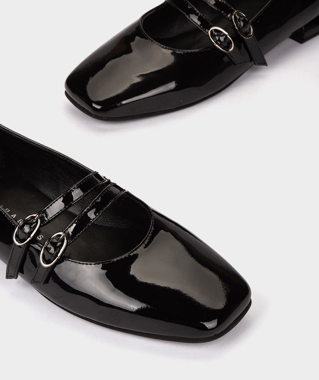 Bailarinas de charol negras. Estas bailarinas son un básico esta temporada, que destacan por su elegante doble hebilla sobre el empeine. Combínalas con faldas,vestidos o pantalones y crea tus mejores looks con ellas; sin duda serán un imprescindible en tu armario que querrás lucir allá donde vayas.