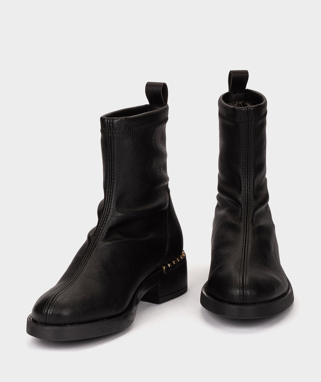 Botines de tejido elástico de color negro. Un diseño versátil y actual perfecto para lucir con looks de diario. Cuenta con una altura perfecta para lucir cómodamente. El detalle de las tachuelas en el talón aporta personalidad al modelo.