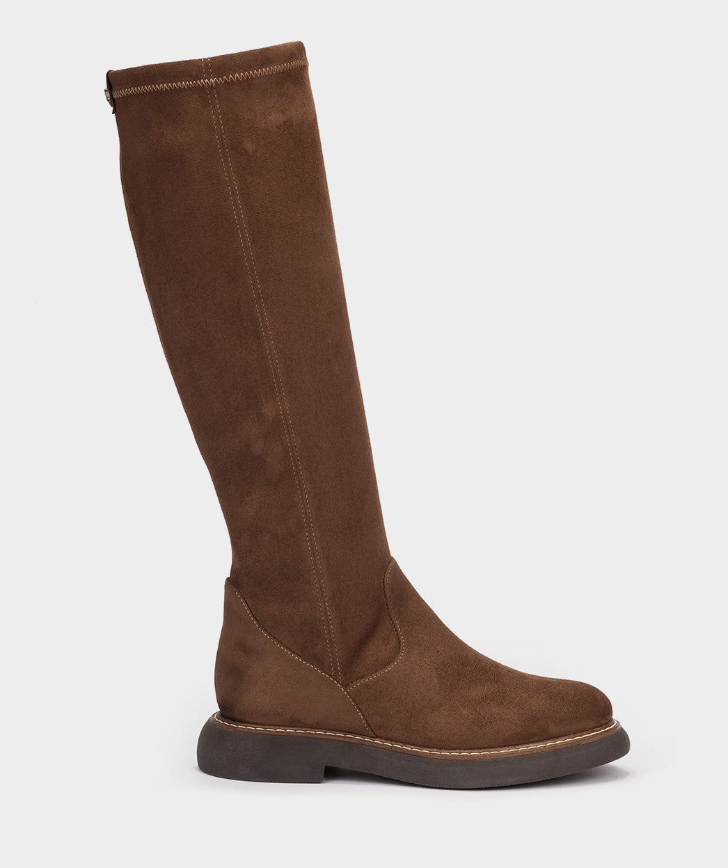Botas de tejido elástico efecto ante de color negro. El material en el que están confeccionadas proporciona un ajuste perfecto a la pierna y una sujeción óptima.