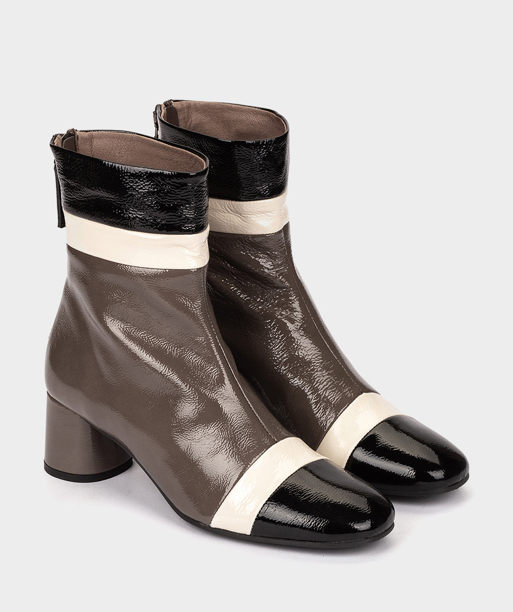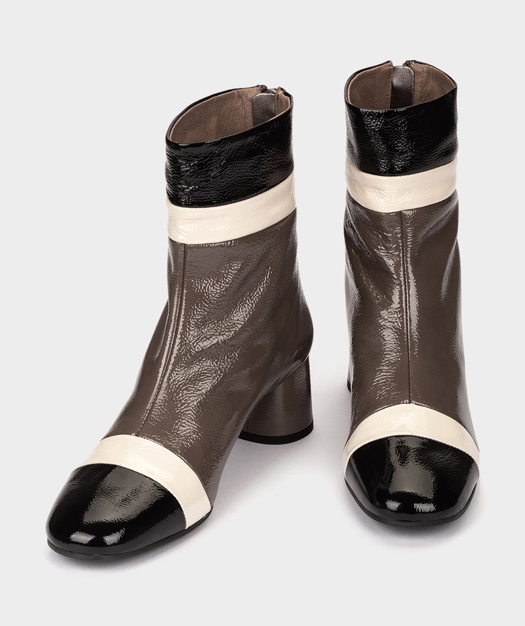 Botines de tacón de charol tricolor. Si buscas un calzado original, versátil y de calidad, estos son los botines que necesitas. Convierte este modelo en tu imprescinidble de la temporada con el que elevarás cualquier look.