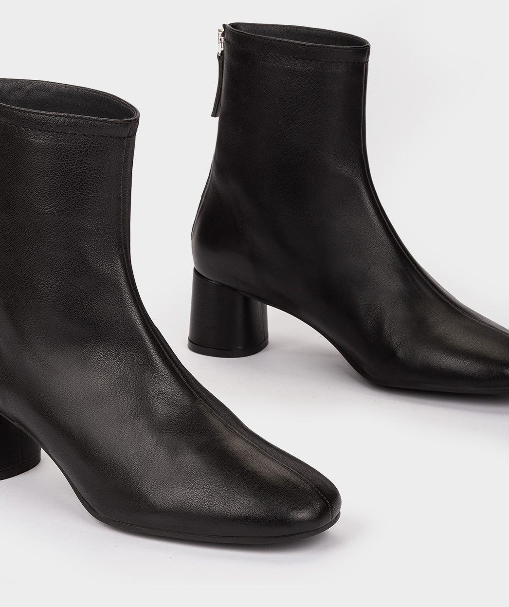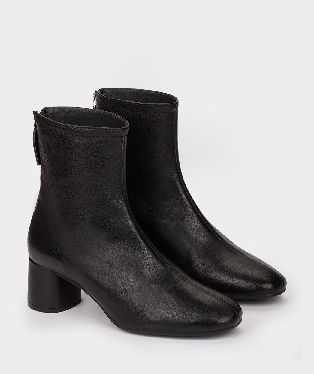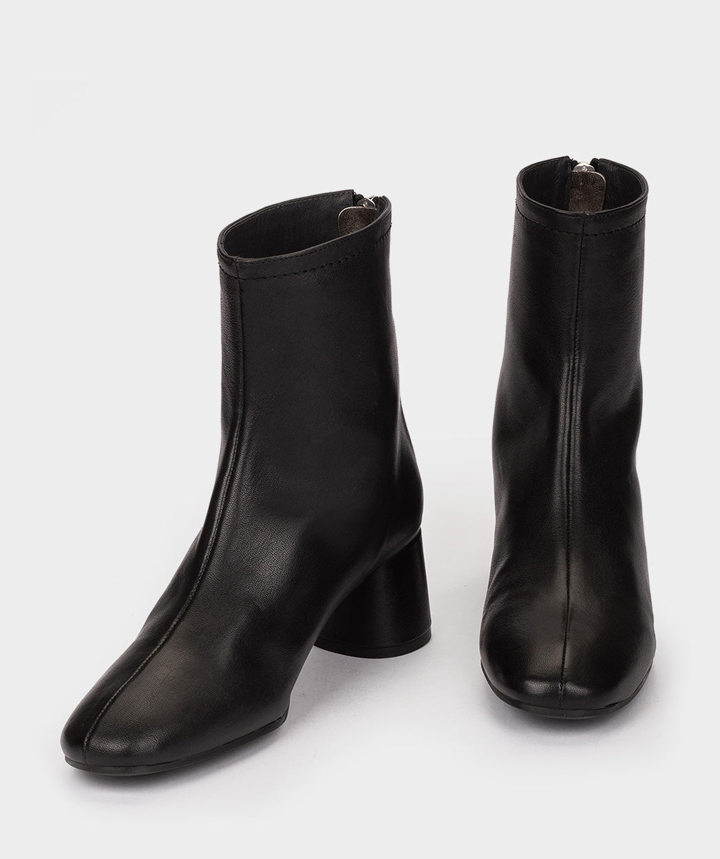 Botines de piel de color negro. Un botín metalizado pero clásico y muy versátil con un toque innovador por su tacón redondo . ¡Será el modelo perfecto para combinar con todos tus looks!
