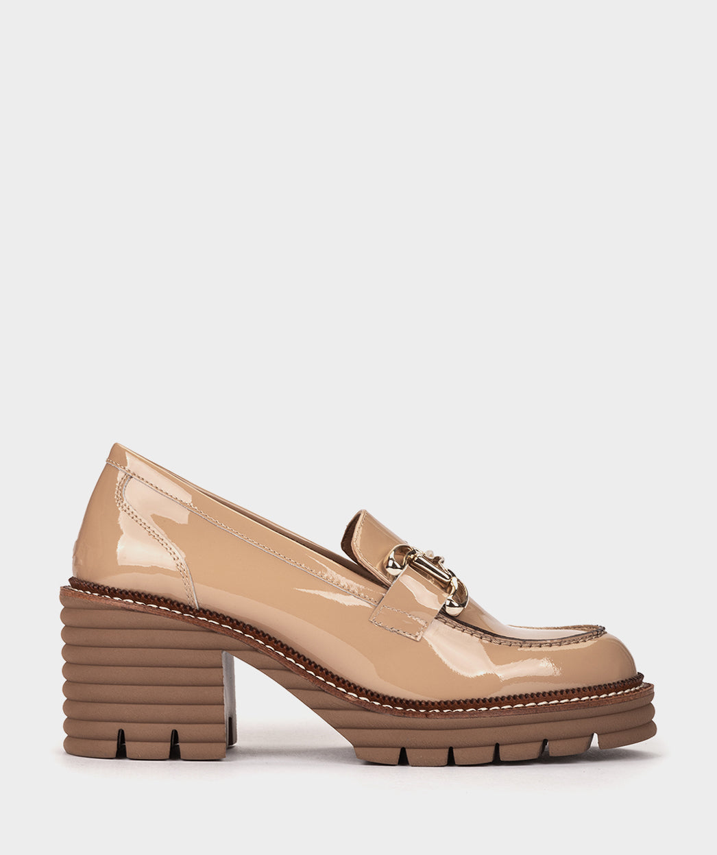 Zapatos de tacón de charol en color beige. Un modelo que combina la silueta de los mocasines con la moderna plataforma y tacón. Destaca por su ligereza.