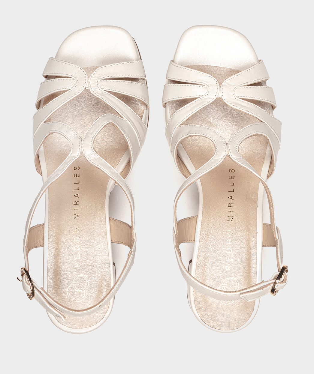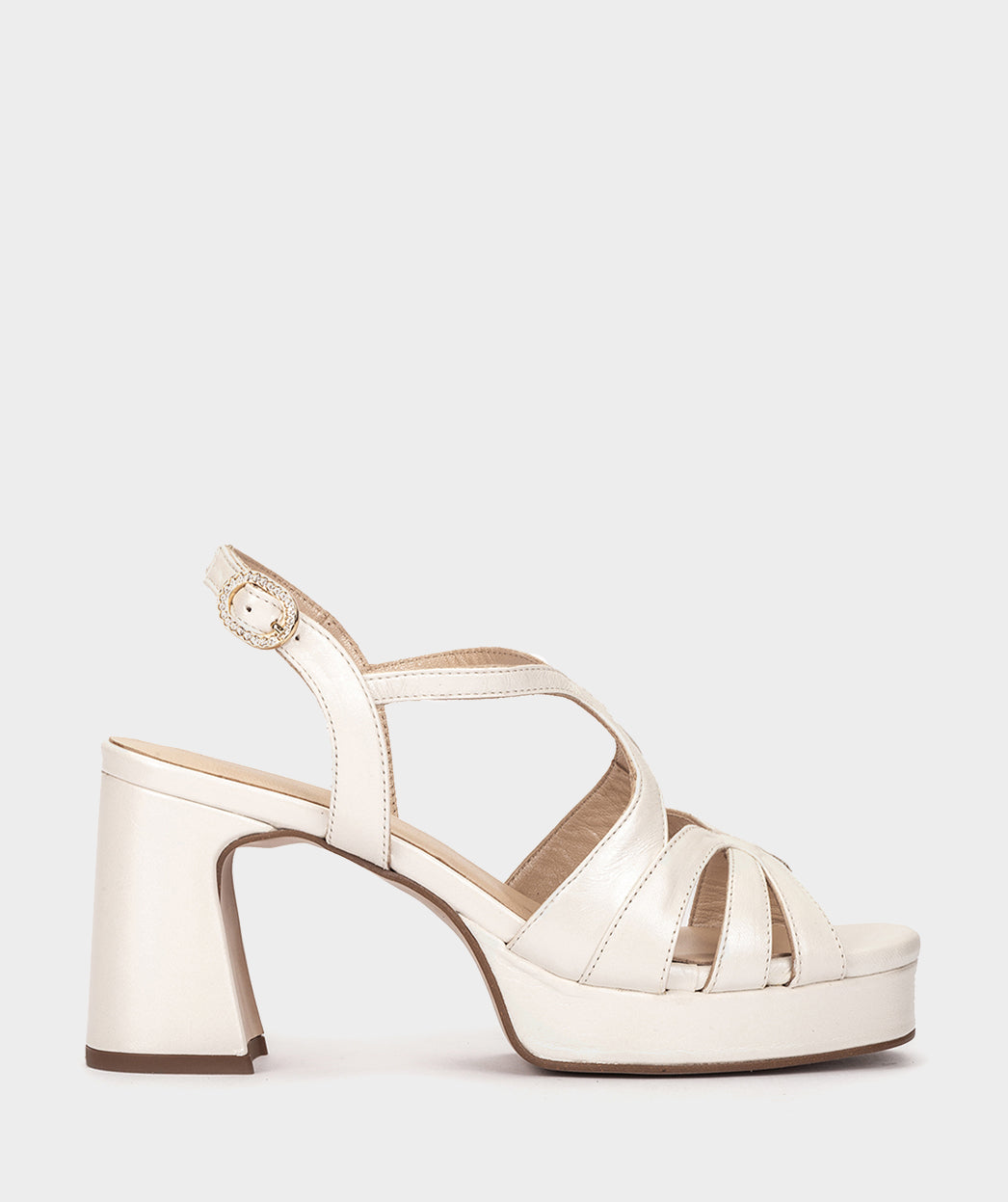 Sandalias de tacón de piel de color blanco perla. La versión del modelo MALAWI apta para quienes buscan un tacón más bajo. MANAUS es el modelo perfecto para lucir en un día especial.