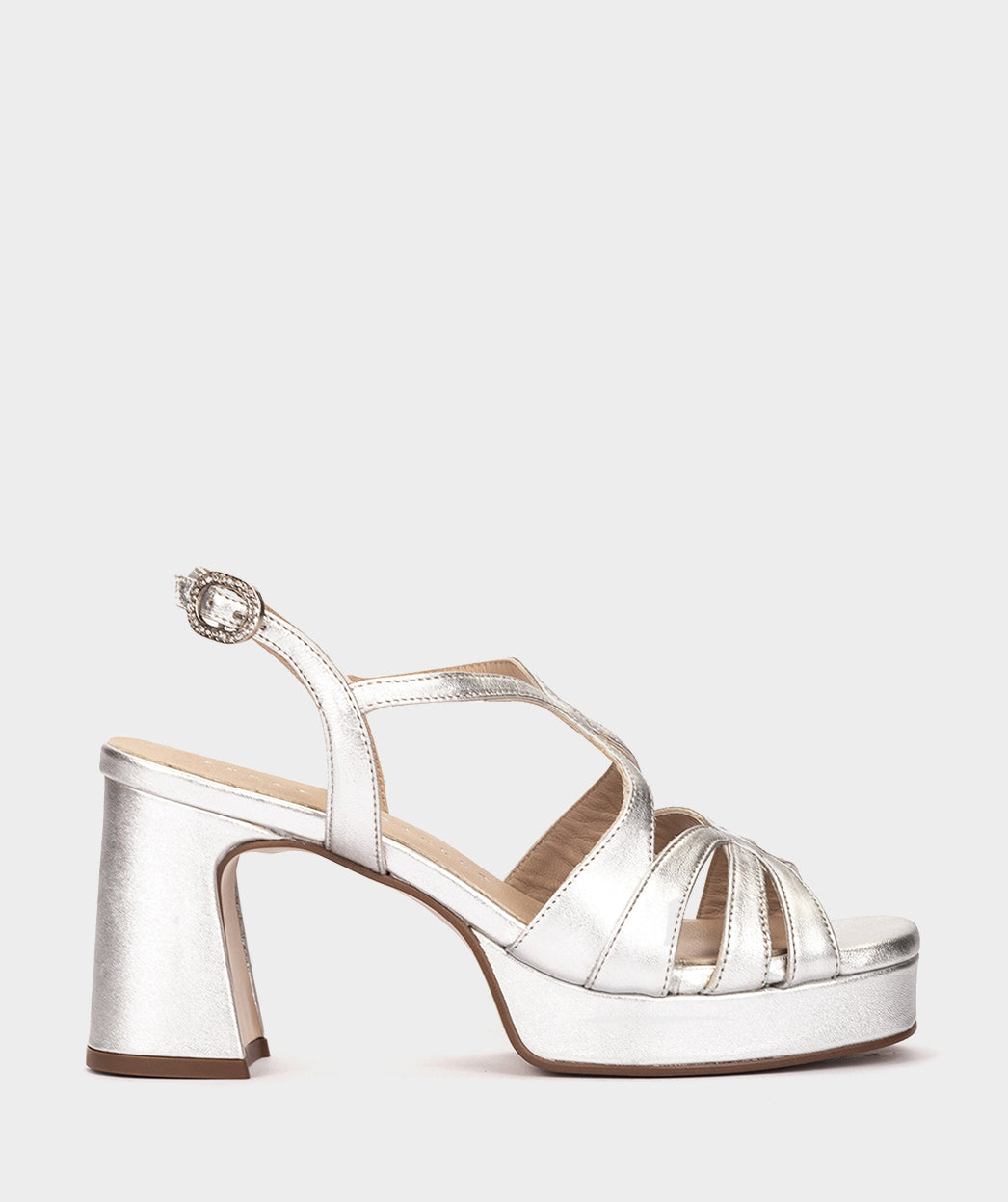 Sandalias de tacón de piel de color plata. La versión del modelo MALAWI apta para quienes buscan un tacón más bajo. MANAUS es el modelo perfecto para lucir en eventos y ocasiones especiales.