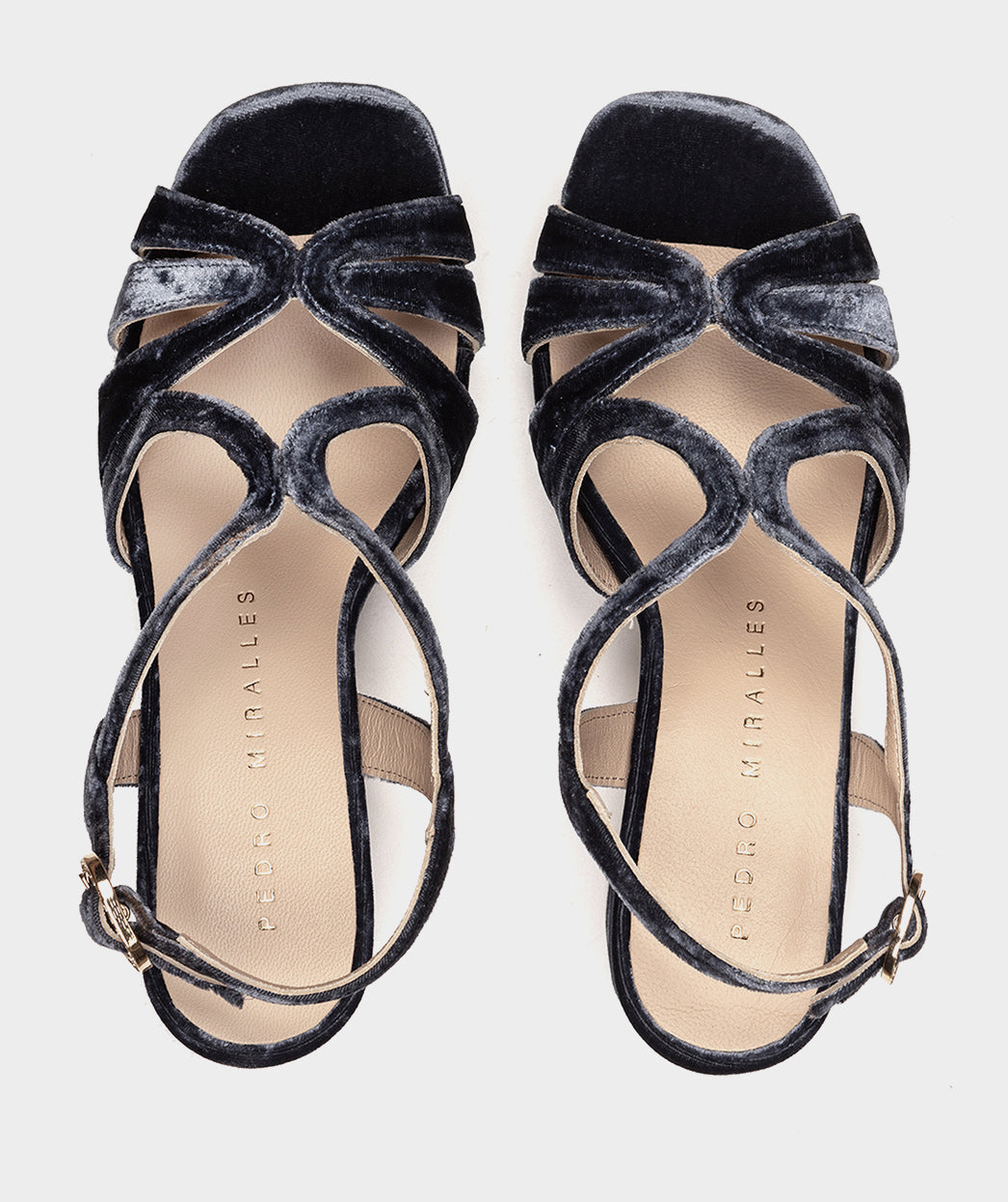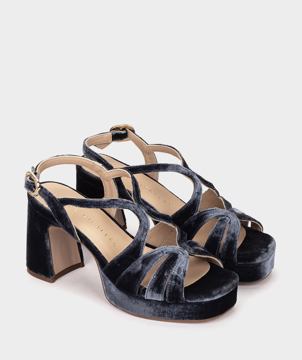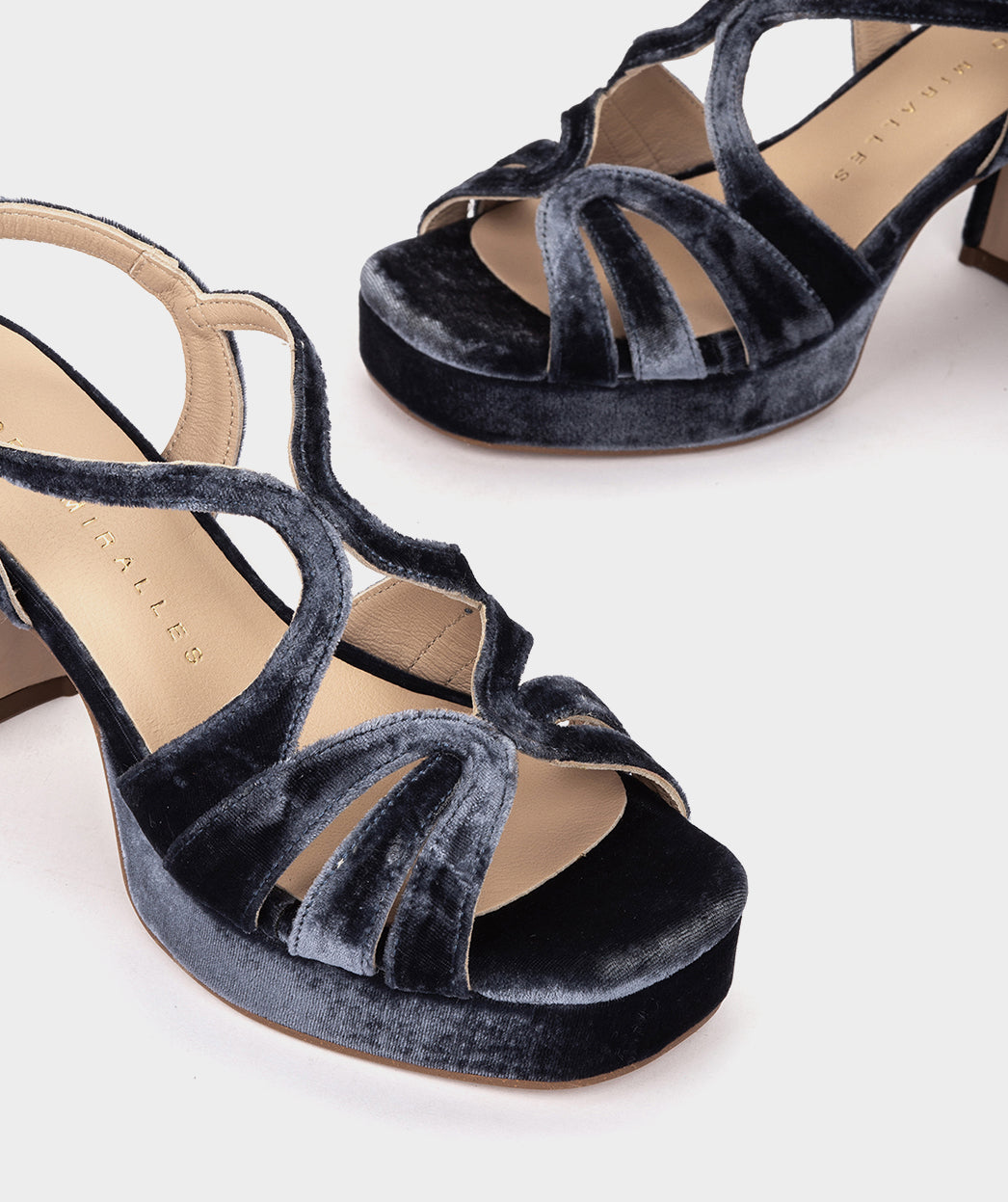 Sandalias de tacón de terciopelo en color azul marino. La versión del modelo MALAWI apta para quienes buscan un tacón más bajo. MANAUS es el modelo perfecto para lucir en eventos y ocasiones especiales.