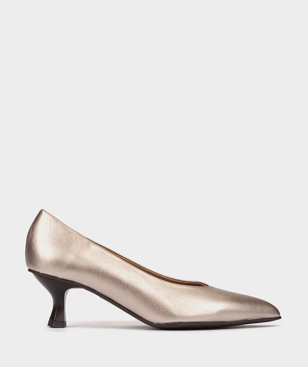 Zapatos de piel metalizada de color humo. Estos salones elevarán tu look gracias a su acabado en punta, que estiliza creando el efecto piernas infinitas. El tacón de este modelo tiene la altura perfecta para poder lucirlo todo el día cómodamente.