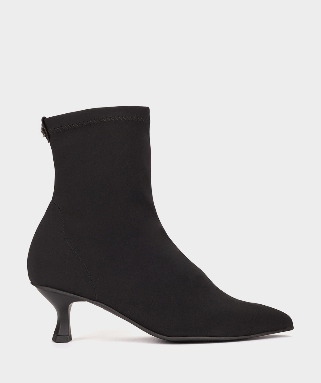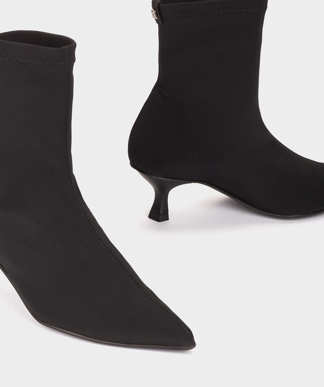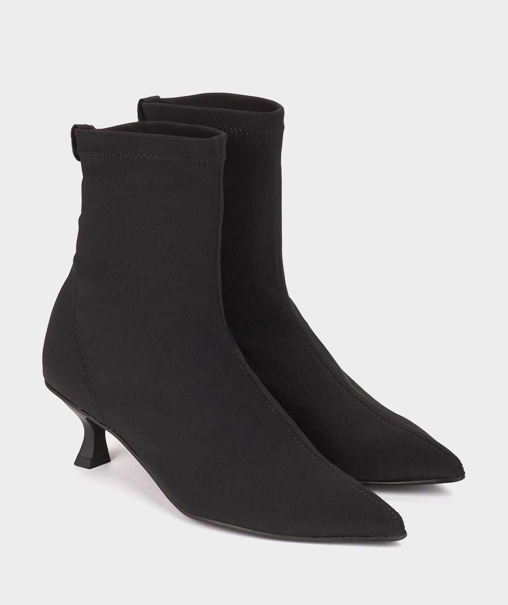 Botines de tejido elástico en color negro. Este material se adpatará a tu pie y te sujetara todo el día, su punta en pico te estilizará todos los looks.
